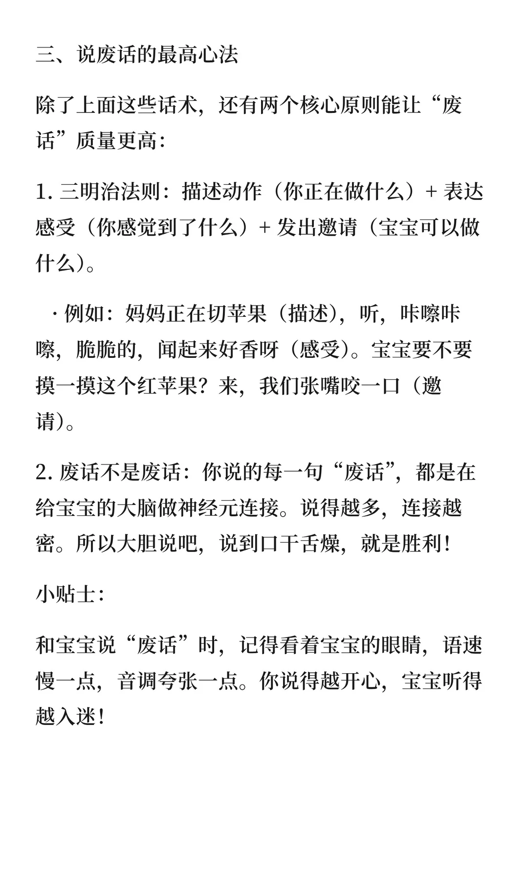 和宝宝聊天是语言启蒙和情感交流的好方法。提供日常场景的“废话”话术,帮助宝宝熟悉声音、语调和情绪表达。通过三明治法则和夸张语调,让“废话”成为宝宝大脑连接的催化剂。