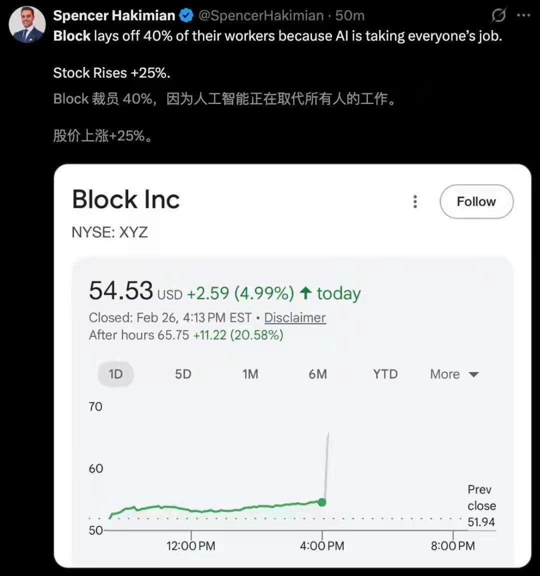 硅谷支付公司block 因为裁员股价大涨[泪奔][泪奔] 因为用了ai技术所以不需要那么多人了。 我们国内公司,特别IT公司估计会依样画葫芦了。 用裁员来提升股价。 以前我们公司发展模式是人越多越好,规模越大越好,来说明实力雄厚。 现在逻辑变了,裁员说明我技术功底强,ai运用的好。[笑哭][笑哭] 只不过裁员赔偿和人家同步就好[打脸]