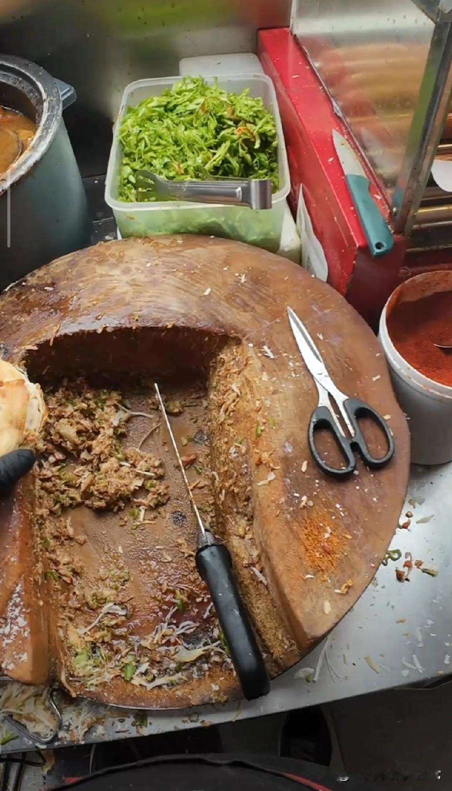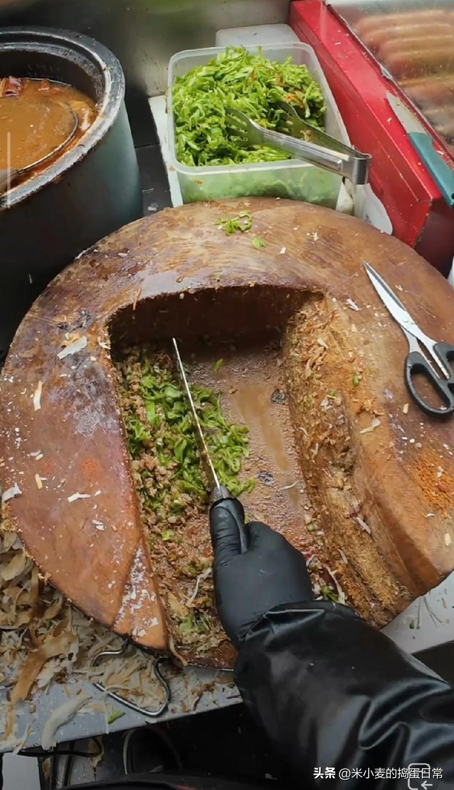这肉夹馍,案板都快成祖传配料了! 刷到一个肉夹馍摊位,我直接看愣了——这案板中间的坑,比我家祖传的菜窖还深! 老板在案板坑里剁肉,刀起刀落,木屑和肉沫混在一起,连旁边的青椒丝都像是从木头里“长”出来的。评论区笑疯了:“少点肉,多点木屑!”“这案板最少传三代,现在都入味了!” 我琢磨着,这哪是肉夹馍啊,分明是“菜板夹肉”。老板说这案板用了十几年,坑是天天剁肉磨出来的,可网友不买账:“吃一口,能尝到三代人的手艺和木头的清香。” 说实话,老手艺确实让人怀念,但这案板的“包浆”也太厚重了。你说这肉夹馍,是吃的情怀,还是吃的木头渣?