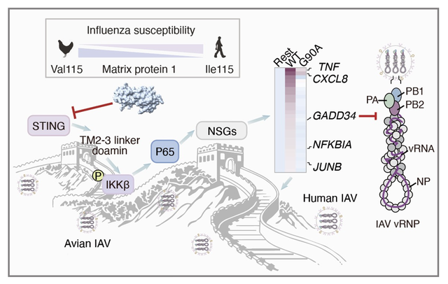 通过分析传染病数据库中十几种跨物种传播的流感病毒,团队发现,人源流感病毒编码的M1蛋白能够有效拮抗人源STING–NF-κB–GADD34抗病毒通路,也就是有更多病毒能抵抗人体的抗病毒策略,而禽源流感病毒的M1蛋白在这一方面能力明显不足。