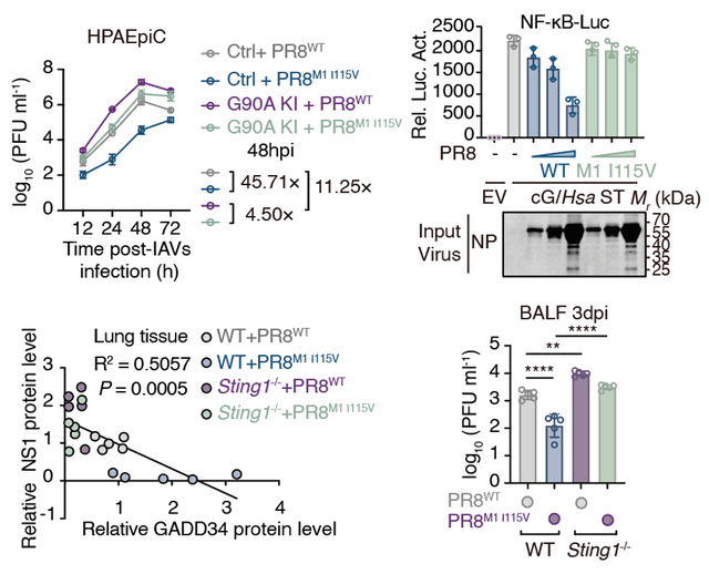 后续研究揭示了流感病毒应对人体免疫屏障的进化策略:M1蛋白第115位氨基酸是由缬氨酸(Val)向异亮氨酸(Ile)进化突变,这一突变显著增强了病毒对人源cGAS-STING通路,尤其是STINGG90A的拮抗能力,从而提高其在人体细胞中的复制适应性。