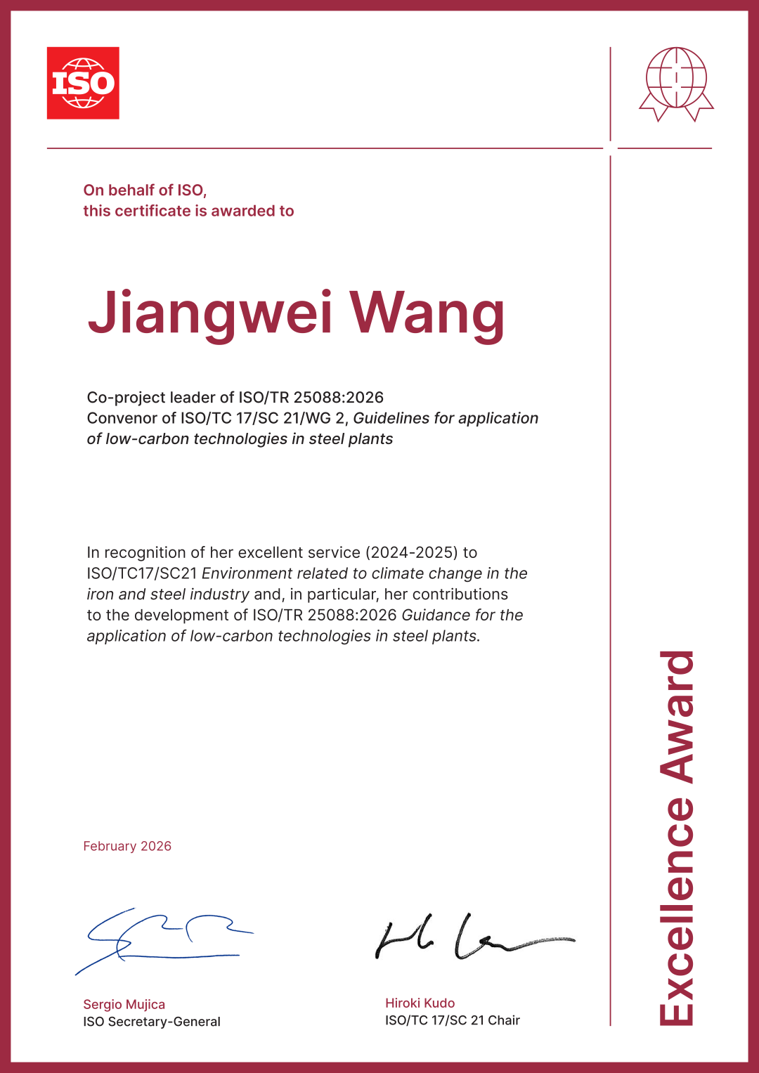 会上,ISO/TR25088项目负责人张龙强、ISO/TC17/SC21/WG2召集人王姜维荣获ISO卓越贡献奖。张龙强院长对获得荣誉表示感谢,他强调,这份荣誉不仅是对个人工作的肯定,更是对中国钢铁行业在国际标准化领域贡献的认可,离不开团队协作和各成员国专家支持。他表示,未来将继续带领团队为全球钢铁行业绿色低碳发展贡献力量。