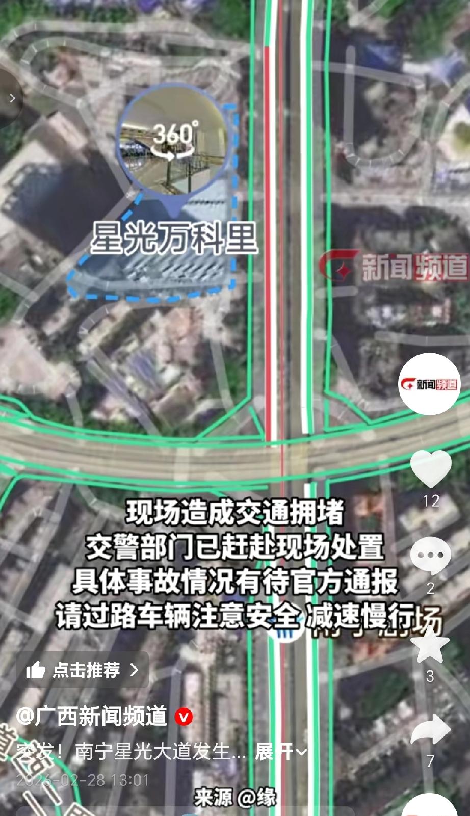 有网友发布一段视频,2月28号中午南宁星光大道桥发生多车追尾事故,事故造成现场拥堵。交警部门已赶赴现场处置,具体事故细节待官方通报,途经该路段需减速慢行、注意避让。(来源于@广西新闻频道 )