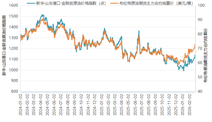 新华财经北京2月28日电(郑大伟)昨日贵金属及原油价格短线拉升,截至2026年2月27日,新华·山东港口·金联创原油价格指数(SPGCIPI)报1139.80点,较前一交易日上涨28.13点,涨幅2.53%;进口原油即期价格为71.58美元/桶,合人民币3567.53元/吨。山东港口进口原油综合到岸贴水估价为-0.73美元/桶,较前一交易日持平。