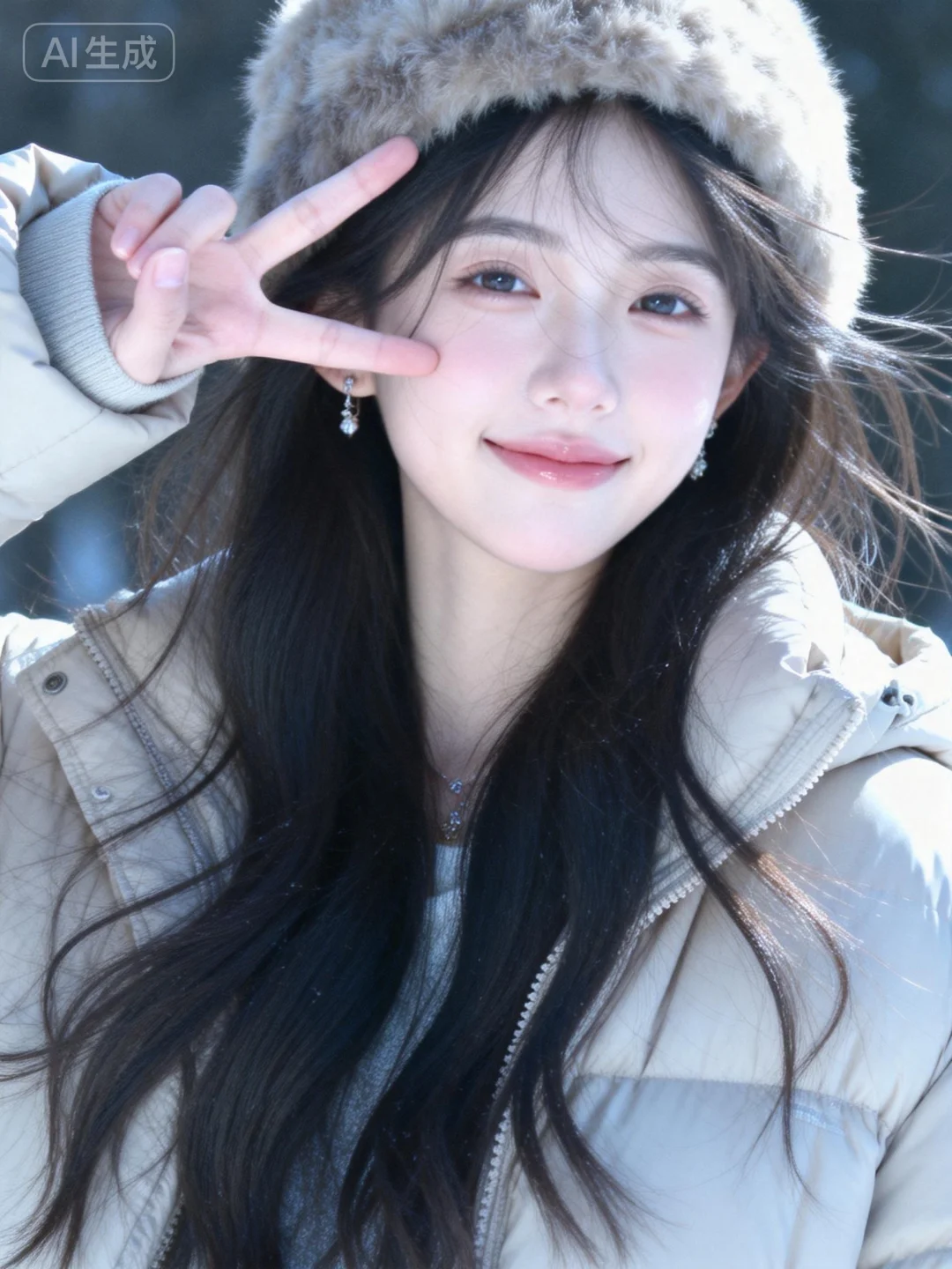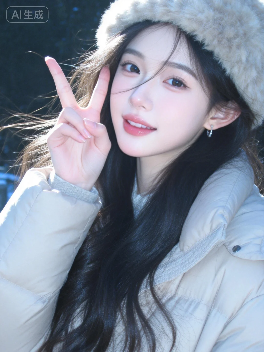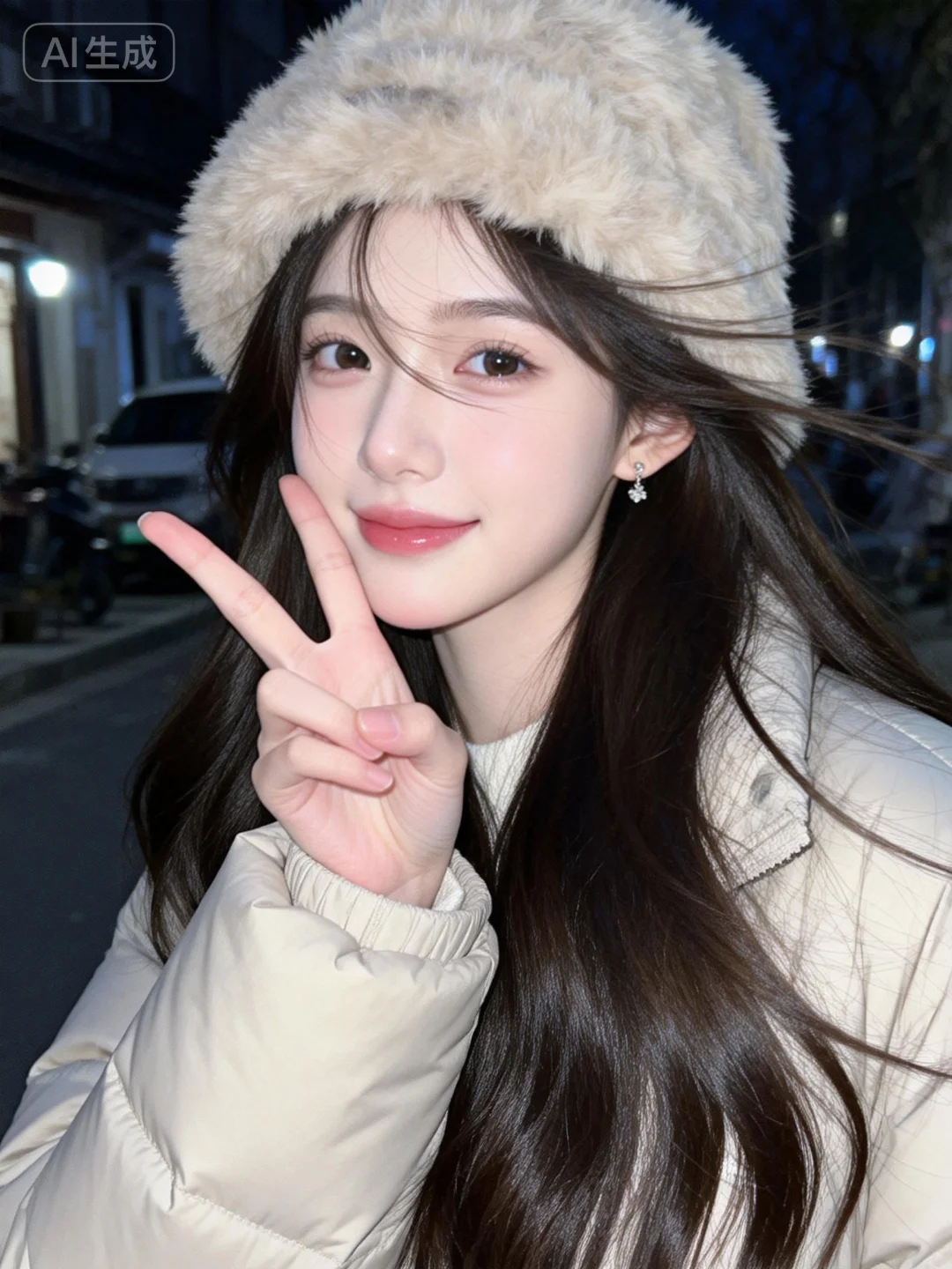 漂亮女生,19岁网红女,冷白皮。穿着浅色羽绒服,毛绒帽子,长发,发丝柔顺有光泽,背景是柔和的街边环境,光线均匀明亮,给皮肤镀上一层清透的质感,带着“夜间随拍”的网感,既日常又有氛围感,手机拍摄风格,古早滤镜,摆pose,(电影级面光:1.6),(光线追踪:1.5),(冷白皮漫感质感的光滑皮肤:1.7),(人物有最好的骨相:1.2),(网感脸:1.6),身材完美,莫兰迪配色,高颜值,19岁女生尖下巴,三庭五眼比例均衡,身材娇小,娇羞的表情,细腻陶瓷水嫩肌肤,偏冷白皮,随机的妆容,随机发型和颜色,随机的饰品,随机的动作,侧光,发丝轻飘,凌乱,随机角度拍摄,总体有很多的不确定性,但又好看,风格甜美少女系,氛围慵懒俏皮,东方美女,年轻娇小,发丝呈现出自然的蓬松感与垂坠感,几缕发丝拂面,冷白皮气质美女,纯欲风,皮肤白皙,偶像气质,fairskin,气质的江南美女子,有点甜美,皮肤美白透亮,表情可爱,甜美氛围,细腻笔触,独特韵味的美,可爱表情,右手比出耶的手势比耶手指靠近脸