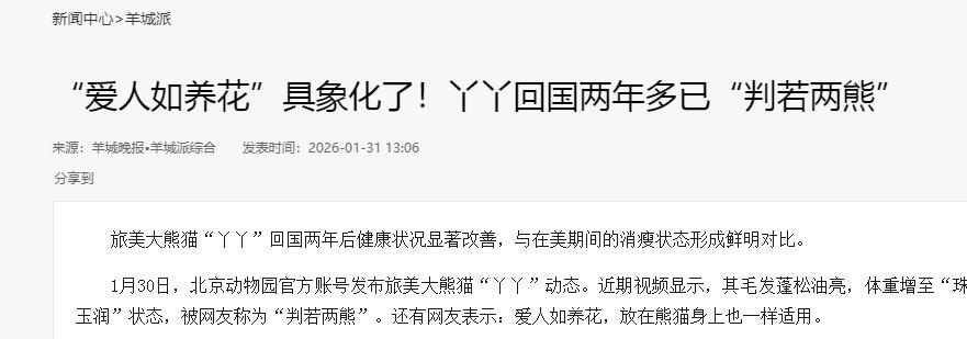 外媒惊叹:一只曾在美国生活的大熊猫被送回中国后,发生了令人惊讶的变化。 无论国内外媒体还是网友们,真实的感受基本都是一句话:判若两熊。 直接给大家来个让人印象深刻的场面画面:刚从美国回来的丫丫,一瘦二小三掉毛,一眼望过去就是娇弱无力,谁看了都会心疼。 但现如今,全国熊猫粉都能松口气,丫丫在祖国怀抱中过得明明白白——活力满满,大口吃竹子、毛色光亮,连歪歪的小动作也增添了几分萌感,网友纷纷夸丫丫“熊生已经重启,彻底升级了。” 其实细看整个过程,并不是单靠一句“接丫丫回家”就能解释清楚的。 丫丫在美国生活了二十年,那些年她在孟菲斯动物园的状态,广大网友真是不敢恭维。 哪怕外媒都表示吃惊,说白了就是丫丫在那里各种状态不佳。 说丫丫是“皮包骨”都不夸张,网上的动物园实拍视频和照片里,丫丫瘦得看得见肋骨,走路有气无力,有时候连精神状态都不太对。 其实,这不仅仅是营养和环境的问题,还关系到大熊猫的适应性。 我国的大熊猫其实是非常需要安静、舒适、有保障的生活条件的,而国外动物园无论设施还是饲养经验,毕竟跟国内没法比。 尤其是孟菲斯动物园,关于饲养大熊猫方面其实很难做到精细化。 比如网上流出过现场视频,可以看到丫丫吃的竹子质量一般,还有水源也不如国内新鲜。 再加上气候、环境适应区别太大,对于丫丫这样本就性格敏感、体质偏弱的大熊猫来说,慢性消耗一下子就显现出来了。 后来不少海外媒体也开始关注,有的报道甚至用了“佩服中国对大熊猫的责任感”这类观点,可见对比是如此明显。 但丫丫的情况是怎么被发现的呢?其实始于国内外网友的关注和呼吁。 每一条热搜下面,都有无数网民真情留言。甚至许多海外动物保护者和科普作者,都愿意联手发声。 也正是这种全社会的共同努力,才让相关部门及时介入。 各级政府、科研院所与国际合作机构顺利达成共识,丫丫回国之旅正式提上日程。 一开始大家还很担心,美方是否配合,过程是否顺畅,所幸一切最后都水到渠成。就在国际媒体镜头下,丫丫终于登上回国专机。 祖国的科研团队对丫丫开展了周密部署:专属的医疗舱、专业的兽医与饲养员全程陪护,每个细节都透着我国对大熊猫无微不至的照顾。 值得一提的是,国家林业和草原局、中国动物园协会等权威专业机构,还联合成立了丫丫健康评估及安置团队。 回国的第一步并不是直接让丫丫见观众,而是做一次彻底的健康体检。 不得不说,我国熊猫保护体系早就做到了“国际标杆级别”。 团队专门为丫丫定制了营养食谱,提供优质新鲜竹子、果蔬混合、营养补剂、不定期理疗。 还有专门的心理疏导机制,技术人员每天跟丫丫用专属“熊语”互动,降低陌生环境的适应压力。 结果也没让人失望。短短两个月,丫丫的体重就重新回到了健康线。 她的黑眼圈也不再“秃噜皮”,整个毛发浓密亮泽。 再去看丫丫日常的短视频合集,你会发现她从躲闪、迷茫,到如今主动跟饲养员互动,坐姿都变得随性放松。 摄像头前有时候甚至会卖个萌,拍拍肚皮、咬咬树枝,怎么看怎么让人心头一软。 微博、B站、抖音上,相关视频点赞转发数轻松突破百万,还有不少国外网友追着要学习中国的熊猫救治理念。 国外的中央通讯社、路透社、CNN等也跟踪报道,评价丫丫的状态为“remarkable recovery(明显恢复)”,并用数据详解中国保护大熊猫的水平遥遥领先。 当然,这一切绝非医术奇迹,更是我国长年坚持科学保护、完善应急救助体系的现实成果。 大熊猫不仅仅是“国宝”这么简单,更是一种高度保护野生动物、珍稀物种的象征。 几十年来,我国从立法、技术、培训,到科研投入,一步一步把大熊猫及其生态环境保护做到极致。 无论是四川卧龙、雅安这些熊猫保护区,还是北京动物园、上海动物园的繁育基地,各项细致入微的管理制度都走在世界前列。 丫丫回家的故事,某种意义上也是中国大熊猫国际形象的一次高光时刻。 每一个懂动物的人都知道,大熊猫其实是最难照顾、最需要情感依赖的原生物种,能把丫丫体质从谷底拉回巅峰,靠的不是“侥幸”,是我国多年来研究、积累下来的全部技术和爱心。 参考: 金羊网——“爱人如养花”具象化了!丫丫回国两年多已“判若两熊”