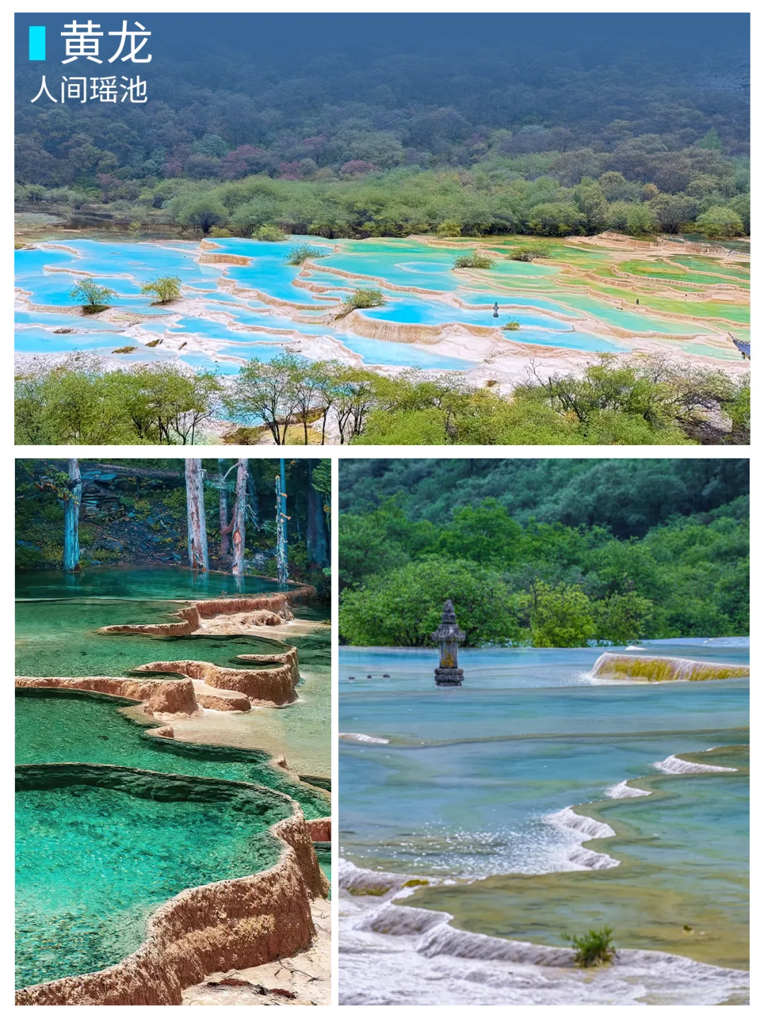 黄龙的五彩池,像上帝打翻的调色盘, 一路拍拍拍,根本停不下来~ 下午返程成都,完美收官!