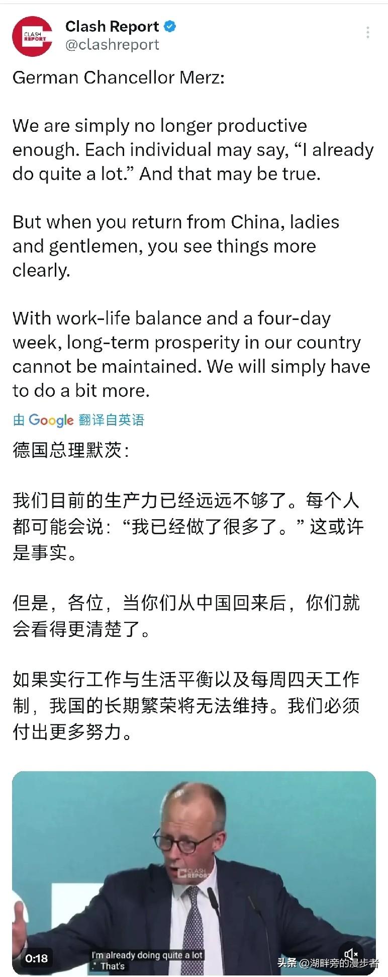看来这次中国之行,让德国总理默茨受到了震撼。在今天(北京时间2月28日)接受媒体采访时,默茨表示:“我们目前的生产力已经远远不够了。每个人都可能会说:‘我已经做了很多了。’这或许是事实。但是,各位,当你们从中国回来后,你们就会看得更清楚了。如果实行工作与生活平衡以及每周四天工作制,我国的长期繁荣将无法维持。我们必须付出更多努力。” 默茨此次访华行程紧凑,先后到访北京与杭州,实地走访人工智能、新能源、智能机器人等领域的中国企业,近距离感受了中国前沿产业的创新节奏与规模化生产效率。作为欧洲经济的重要支柱,德国长期依托制造业保持国际优势,近年却面临经济增长放缓、制造业岗位收缩、失业率上升等压力,国内围绕工时、福利与竞争力的讨论一直存在。 这番基于实地观察的表态,是默茨对德国生产力现状与未来竞争力的直接反思。他并非否定生活质量的重要性,而是在全球产业竞争加剧的格局下,提醒德国社会需要在舒适节奏与长期繁荣之间找到平衡。中国在数字化、智能化领域的快速推进,与德国本土的产业转型压力形成鲜明对照,也让这位德国总理对国家发展方向有了更清醒的判断。 中德两国历史背景、社会结构与发展阶段各不相同,在工作制度、社会治理、产业发展上的选择,均立足于自身国情。不同国家基于现实需求做出的规划,各有其合理性与针对性。在全球化时代,保持开放观察、理性借鉴,更有助于各国稳步推进自身发展。 各位读者你们怎么看?欢迎在评论区讨论。默茨访华