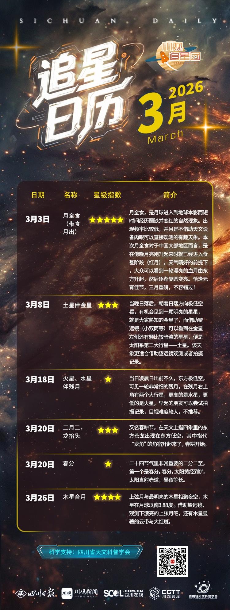 三月的夜空从不吝啬浪漫,从元宵节月全食到行星相伴,从传统星象到节气更替,每一场天象都是宇宙写给人间的情书。抬抬头,即可遇见宇宙的温柔与震撼。