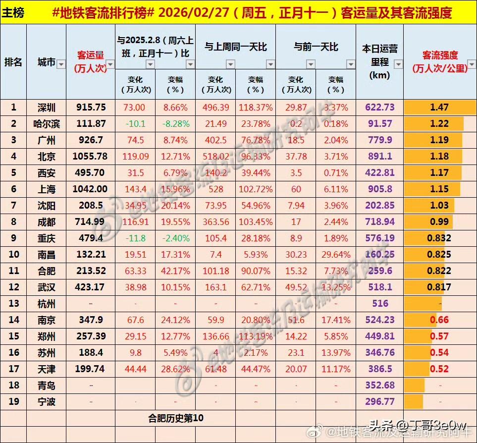 年后,武汉地铁客流量昨日首次突破400万人次大关[呲牙][呲牙][呲牙] 爆料 身边事 中国地铁客流日报 地铁客流排行榜 昨日客流 春运 排行榜 武汉 2月27日 星期五,正月初十一 全国地铁客流量城市排行榜: 北京1055.78万 上海1042.0万 上海爆料 广州926.70万 广州地铁 深圳915.75万 成都714.99万 成都地铁 西安495.70万 西安爆料 重庆479.40万重庆身边事 武汉423.17万武汉地铁 杭州347万+杭州地铁 南京347.90万 郑州257.39万郑州爆料 合肥213.52万合肥身边事 沈阳208.50万 沈阳地铁 天津199.70万 苏州188.40万苏州爆料 青岛132万+青岛身边事 南昌132.21万南昌地铁 宁波111万+ 哈尔滨111.87万