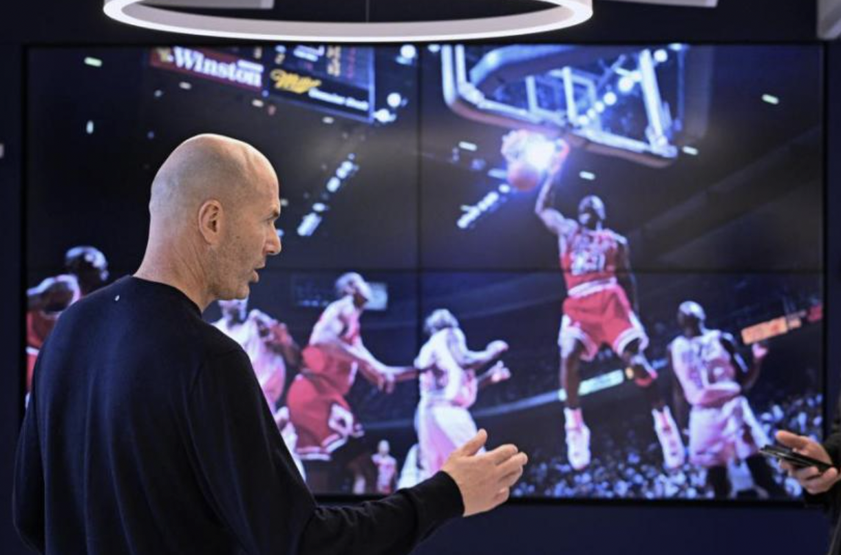 要我排第一的话,乔丹一定离榜首不远。篮球界总会有杰出的球员,比如法国的托尼-帕克,但迈克尔-乔丹,他的地位始终很高,稳居巅峰。(说着齐达内缓缓举起手指向天空)看啊,看啊,凌驾于所有人之上……他飞得多么高啊!