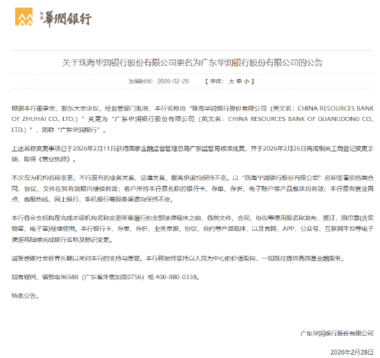 珠海华润银行表示,上述名称变更事项已于2026年2月11日获得国家金融监督管理总局广东监管局核准批复,并于2026年2月26日完成相关工商登记变更手续,取得《营业执照》。本次仅为机构名称变更,该行原有的业务关系、法律关系、服务承诺均保持不变。以“珠海华润银行股份有限公司”名称签署的各类合同、协议、文件在其有效期内继续有效;客户所持该行原名称的银行卡、存单、存折、电子账户等产品载体均有效;该行原有营业网点、客服热线、网上银行、手机银行等服务渠道均保持不变。该行各分支机构在完成本级机构名称变更所需履行的全部法律程序之前,各类文件、合同、协议等使用原名称发布、签订,原印章(含实物章、电子章)继续使用。该行银行卡、存单、存折、业务单据、协议、合约等产品载体,以及官网、App、公众号、互联网平台等电子渠道将陆续完成银行名称及标识变更。