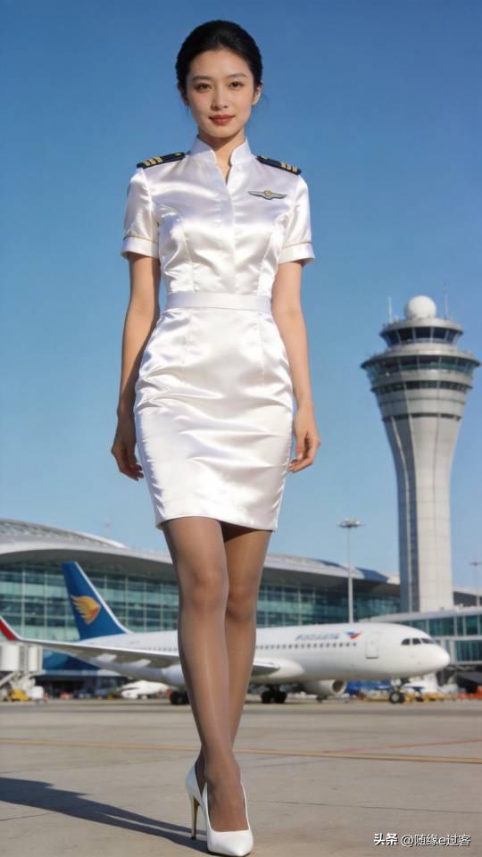 身穿白色制服的美女空姐在机场写真。机场空姐写真 职业套装