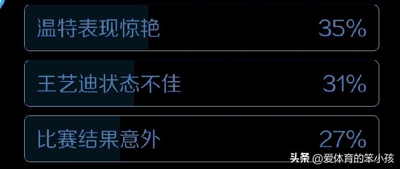 WTT新加坡大满贯赛的赛场上,来到女单8进4的争夺轮,其实很多球迷都能感觉到,4场8进4比拼当中有国乒球员参加的比赛里面,最难赢下的一场比赛,也是最硬的一块骨头当属德国老将沙宾温特这位新科的欧洲单打冠军。她确实在技术打法的先进性、全面性以及整个比赛韧性还有体能等方面拥有一定的优势,再加上大赛经验也不缺乏,让这位进入职业生涯末期的德国老将如今已经来到了一个职业生涯新高度。 反观和沙宾温特交锋的国乒名将王艺迪,本身就属于那种场上容易失误,一旦心理起急,就容易在场上起伏性明显的球员,而且她既不能像王曼昱那样拥有超强的防守能力,又不能像孙颖莎那样在场上特别善于动脑筋,所以这场比赛王艺迪也体现出了和沙宾温特综合作战能力方面的劣势,最终遭遇了一场2:4的失利,让1992年出生的沙宾温特这样一位34岁的老将赢得比赛,甚至是相对轻松的就从身自己身上踏过去,确实让王艺迪的整体竞争力,特别是打一些综合能力全面的对手能力不足的问题被显现出来,双方六局的具体比分是:11:4,5:11,11:9,5:11,4:11和4:11。 相信大家也看出来了,如果说前三局王艺迪还能在场上即使有起伏也稍稍占据上风的话,明显第四、第五、第六局她已经在。沙宾温特的强势发挥,特别是正手强势进攻面前,失去了自己的防守能力,而且越打越着急。以至于很多球迷给王艺迪的一个评语是,她还是没能熬过这个冬天。确实这段时间王艺迪在外战当中的稳定性是明显欠缺,职业生涯进入后期之后,也开始进入了新的低谷期。新教练于子洋虽对王艺迪有所帮助,也难以阻止她竞争力下滑的趋势。 而在各路媒体进行的调查问卷环节,有36%的球迷认为沙宾温特在这场比赛中的表现堪称惊艳,确实让人意识到了她的个人竞争能力。而另有31%的球迷则认为王艺迪明显状态不佳,同时还有26%的球迷认为这场比赛的结果有些意外。显然,沙宾温特的强势发挥让他们意识到了这匹黑马已经越来越黑,大有在世界赛场上搅局的意思。同时还有10%左右的球迷则知道沙宾温特下一轮将和4:2战胜张本美和,成功晋级四强的王曼昱正面交锋,都期待王曼昱能在这样一场强强对话当中有出色表现。而对这一观点持支持态度的球迷达到10%。 可见沙宾温特越是强势晋级四强,还能轻松战胜王艺迪?越是让球迷们对王曼昱和沙宾温特的下一轮比赛充满期待,也让我们同样带着这种期待看看下一轮王曼昱和沙宾温特间会有怎样的交锋。