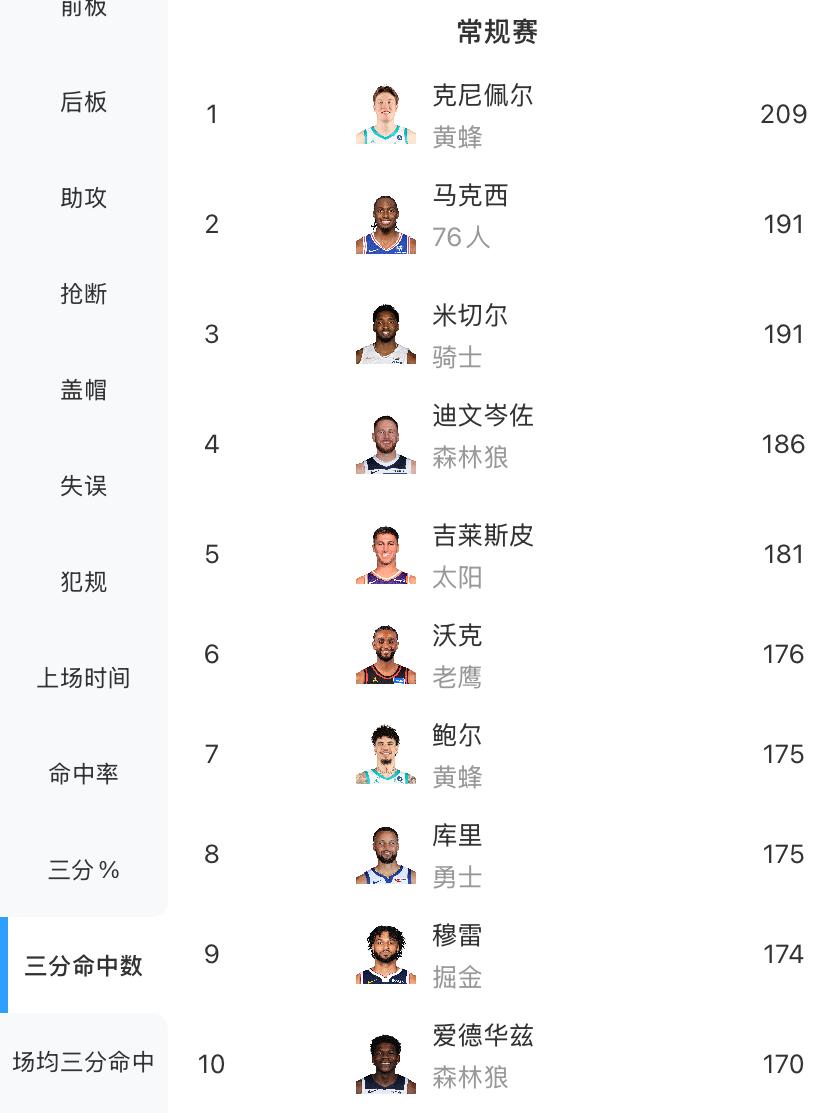 除了库里外,汤神,哈登,利拉德齐齐落榜,想不到这曾经的四大三分天王本赛季竟然只有库里勉强进入前十,着实让人想不到,利拉德因伤没打可以理解,而哈登目前155记三分,克莱153,三分王离他们渐行渐远…… 不过从库里引领的三分时代到来后,三分已经成为很多球员主要的得分手段,但即使是这样想要单个赛季拿到300记三分也是够难的,目前仅有五人做到过10次,库里一人独占6次,哈登,华子,比斯利和汤神各一次……