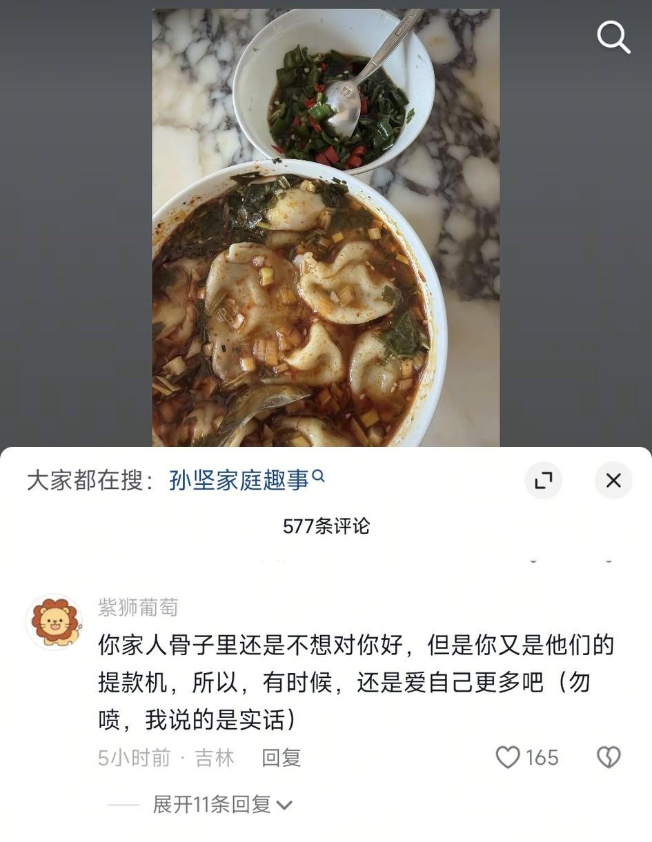 孙坚又上热搜了,这回既不是新戏也不是综艺,居然是为了一碗酸汤饺子。 他在视频里说,之前有次工作忙到整个人都快垮了,妈妈给他煮了碗酸汤饺子。就这一碗饺子,直接给他整破防了,说那一刻满脑子都是妈妈好爱自己。 本来是挺戳人的温馨片段,结果网友看完全皱起了眉。 原因大家都太熟了,孙坚之前没少在网上说家里的事,说全家都把他当苦力,他一个人养着一大家子,却半点尊重和疼爱都没捞着,甚至崩溃到在网上哭诉过。 一边是被全家当提款机压榨的满腹委屈,一边是一碗饺子就彻底软化的感动,有网友直接戳破了:“你家人骨子里还是不想对你好,可你又是他们的提款机啊,多爱自己一点吧。” 说真的,一碗饺子就能让他感动成这样,说到底,不过是个缺爱的人,对亲情抱着太小心翼翼的渴望而已。 他不是忘了那些糟心的日子:姐姐住月子中心十五万的账单直接挂在他头上,妈妈的理疗费、弟弟的房贷,全要他来扛。那些不被尊重的委屈,一个人硬扛的崩溃,他都清清楚楚记着的。 可就是因为太想要这份亲情了,所以妈妈稍微给一点甜头,他就立刻卸下了所有防备。别人眼里不值一提的一颗“甜枣”,是他等了太久太久的温柔啊。 可反过来想,要是一份爱,需要靠一碗饺子来证明,那这份爱本身,就已经太单薄了。 真正的亲情,从来都不是偶尔一次的施舍式温暖,而是长年累月的尊重和放在心上。 亲情从来都不该是绑在身上的无底债,懂事也要有底线。先把自己的日子过舒坦了,才谈得上什么孝顺。