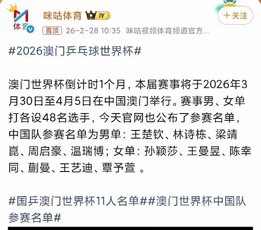 不出所料的失望,2026年3月底世界杯名单公布,没有樊振东。男队参赛名单为王楚钦、林诗栋、梁靖崑、周启豪、温瑞博。这一消息的公布,让东哥球迷很是不解,其实现在也应感到庆幸,幸亏东哥去德甲了,不然双方多尴尬,东哥应该是预判到了一些事情。现在东哥的德甲之行,正好成了理由,也算个很好的理由,大家都体面。乒出精彩当乒乓遇到中国年