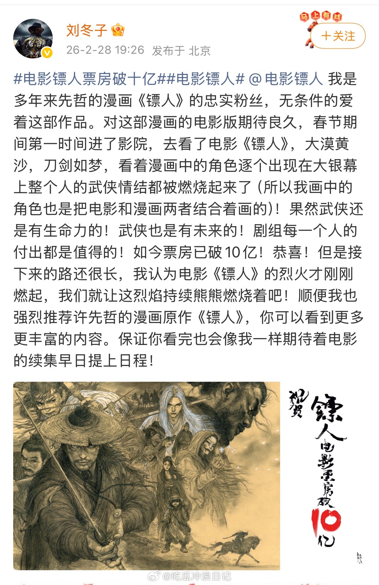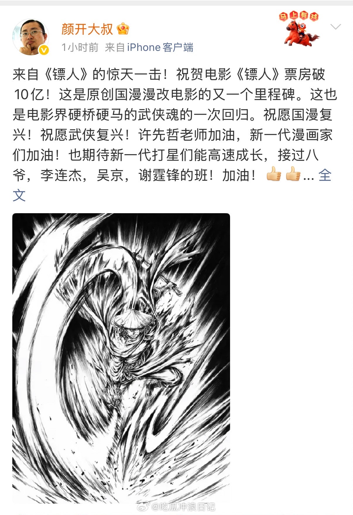 镖人 贺图 《镖人》票房破10亿让国漫圈画手集体出来道贺了!颜开、刘冬子、墨飞、Zcloud、Rc、优癖、吴淼,都是我很喜欢的大大看到大家都在致敬这部武侠硬核之作真心为《镖人》感到开心,这就是属于好作品的排面,一份让国漫与武侠双向奔赴的荣光。黄沙未尽,侠气不息,好作品自有万钧之力,《镖人》值得所有偏爱与盛赞!