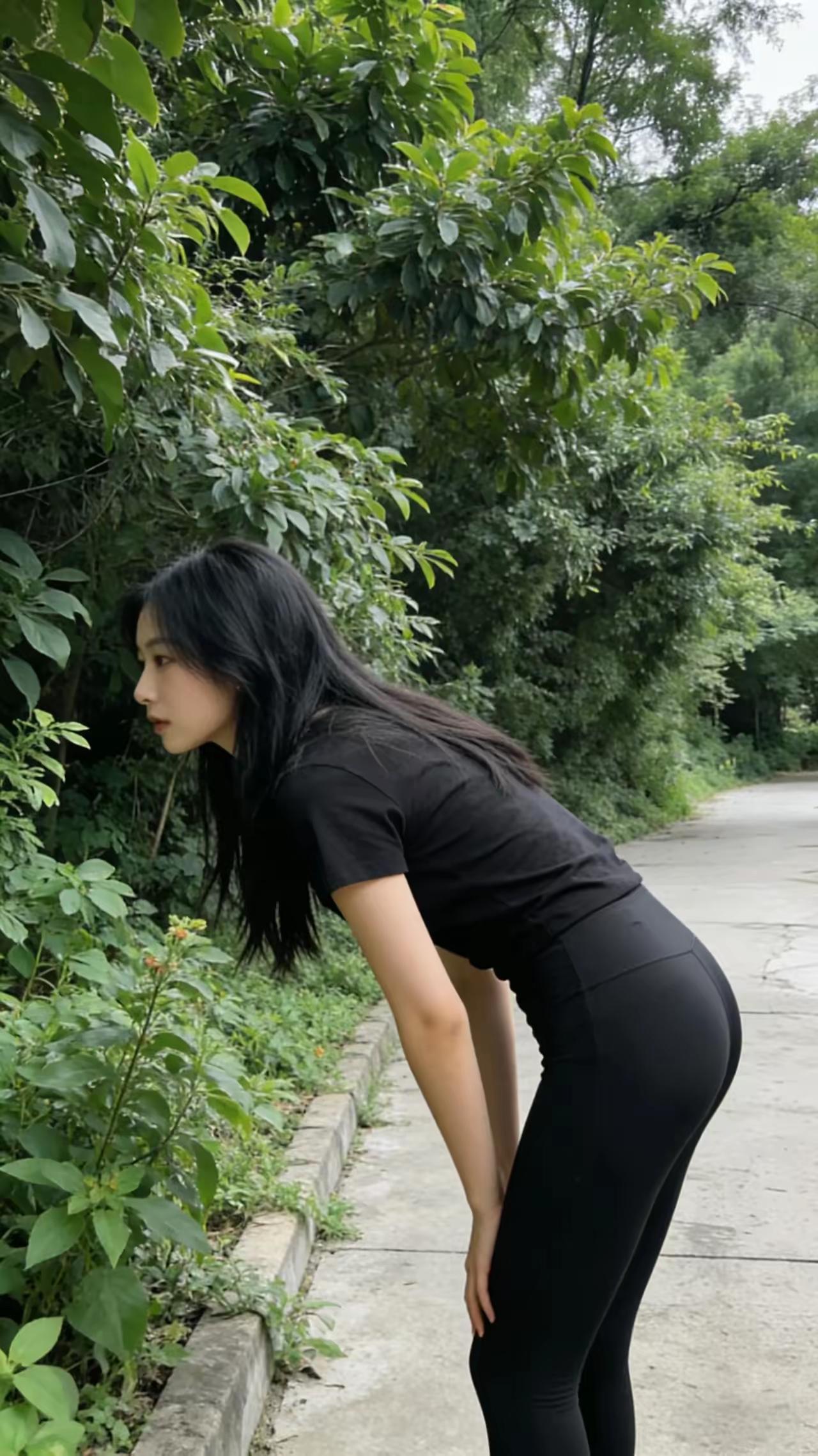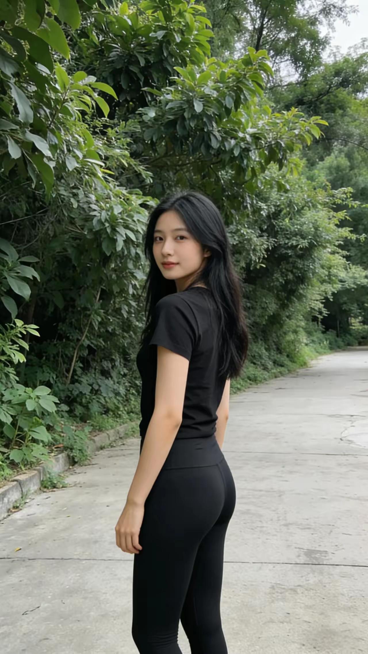 黑衣少女漫步绿荫道,自然清新,尽显青春活力!🌿👗💃