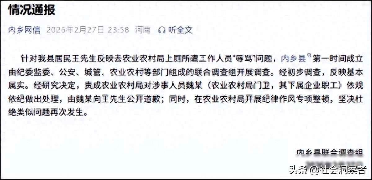 市民内急进政府公厕,被门卫骂“眼瞎”!官方通报来了,身份更耐人寻味 2月14日,河南南阳内乡县王先生买菜途中内急,看到农业农村局门口挂着公厕对外开放的牌子,便进门问路。 他高度近视没戴眼镜,看不清指引,礼貌询问位置,没想到门卫魏某当场发飙:你眼睛瞎了不会自己看? 王先生忍气如厕,想沟通提醒对方态度,对方不仅不理,还摔门刁难。拍视频时,门卫更是嚣张回怼:我还把你当神敬嘞? 王先生联系领导无人接听,无奈将视频发到网上,迅速引爆舆论。 2月27日,官方联合调查组通报:情况基本属实,责令魏某当面道歉,全县开展作风整顿。 更让人意外的是,魏某并非正式在编人员,而是下属企业职工。一句恶语,寒了民心,也暴露了管理漏洞。 挂着便民牌子,却摆着官威架子;承诺对外开放,却连基本尊重都做不到。道歉容易,改作风难。 下属职工在机关门口如此蛮横,到底是谁给的底气?对外开放的公厕,究竟是真心便民,还是做做样子? 此事虽小,却照见服务意识的短板。希望整顿不是一阵风,别让一块公厕牌,寒了老百姓的心。