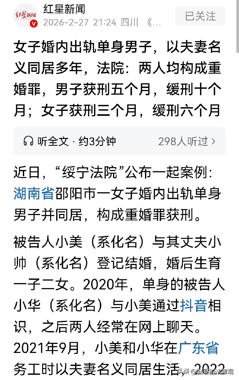毫无底线!湖南邵阳,女子婚后已有3个孩子,在网上聊了一男的,两人很快突破底线,做了夫妻之事。为了长厮守,女子狠心扔下3个孩子和丈夫,偷偷和男的私奔,他们在多个城市打工,以夫妻名义同居,丈夫还傻傻的蒙在鼓里。两人的好事被丈夫无意间撞破,两人又跑到另一个城市继续同居。丈夫怒斥:咋面对3个孩子? 小美和丈夫结婚10多年,开始小两口子恩恩爱爱,小美生下一个儿子两个女儿。 小日子虽平淡,却也充满了家庭的温馨。 小帅每天努力工作,想着多赚些钱,让妻子和孩子们能过得更好。 丈夫舍不得让妻子出去工作,小美也就有了更多的时间上网。 小美下载了交友软件,认识了单身的小华。 小华风趣幽默年轻帅气,小美一下子就被吸引住了。 两人开始频繁地在网上聊天,似乎有说不完的话题。 随着越来越熟悉,交流逐渐升温,一种别样的情愫在两人心中悄然滋生。 两人最终突破道德底线,约了线下见面,还到酒店开房,做了夫妻之事。 那次之后,他们再也收不住了,谁也离不开谁,已婚有3个孩子的小美,竟和对方商量好一起私奔。 两人来到一个陌生的城市打工,以夫妻名义共同生活。 他们租了一套房,像真正的夫妻一样,每天一起上下班,过着看似甜蜜的生活。 2022年,两人回到当地打工,小美对家里的3个孩子和丈夫不问不闻,人也不回家。 两人的胆子越来越大,甚至在朋友面前也毫不避讳地以“老公”“老婆”相称。 小美的合法的丈夫小帅,带着三个孩子艰难的生活。 后来小帅在一次偶然的机会,发现了小美并未在外地打工,而是和另一男人同居。 他感觉自己的世界都崩塌了。 他怎么也想不明白,曾经那个温柔贤惠的妻子,怎么会做出这样的事情。 愤怒、痛苦、失望,各种情绪涌上心头。 他试图找妻子理论,质问她为什么要背叛自己,背叛这个家庭。 小美一开始还有些慌乱和愧疚,但有小华撑腰,她就理直气壮起来,甚至和丈夫大吵一架。 为了避免和丈夫正面冲突,继续和小华在一起。 2023年,小美又和小华跑到浙江去打工。 在这个陌生的城市里,他们仍以夫妻的名义共同生活。 他们以为这样,就能逃避法律的制裁,逃避道德的谴责。 然而,他们错了,法律的红线是绝对不能触碰的。 2025年,小帅在发现小美出轨后,虽然内心痛苦万分,他收集了证据后,报了案。 警方经过调查,发现小美和小华,确实存在重婚的犯罪事实。 警方立案侦查,并由检方提起了公诉。 法庭上,小华站在被告席上,低着头,脸上仍是满不在乎。 他承认,自己一开始就知道小美是有配偶的人,但还是被感情冲昏了头脑,和小美以夫妻名义同居生活。 小美表示,自己对不起丈夫,对不起三个孩子,但事情已经发展到这一步,她也无可奈何。 法院经审理认为,小美在婚姻关系存续期间,与小华以夫妻名义同居生活,属于有配偶而重婚。 小华虽是单身,但他明知小美已婚,仍与其以夫妻名义同居生活。 属于“明知他人有配偶而与之结婚”的情形。 两人的行为,均符合重婚罪,依法应追究其刑事责任。 最终,法院以重婚罪,判处小华拘役5个月,缓刑10个月。 判处小美拘役3个月,缓刑6个月。 听到判决结果的那一刻,两人都傻了眼,他们终于为自己的不道德行为,付出了惨痛的代价。 其实,如果觉得婚姻不幸福,夫妻实在过不到一起,可以离婚,各自放对方一马。 既不离婚,还不管不顾的和别的男人同居,既不道德,还违法。 俗话说,娶妻不幸害三代,果真如此。 年纪幼小的3个孩子,从小在别人的指指点点中长大,以后会怎样看待他们的母亲? 小美有了这次的案底,有可能会对孩子们长大后的生活产生影响。 在这个充满诱惑的时代,人们需要保持清醒的头脑,坚守道德底线。 婚姻不是儿戏,它需要用心去经营,用责任去维护。 一旦选择了婚姻,就要对伴侣忠诚,对家庭负责。 如果感情真的出现了问题,也要通过合法、合理的途径,去解决问题。 依据《刑法》第258条规定:“有配偶而重婚的,或者明知他人有配偶而与之结婚的,处2年以下有期徒刑或者拘役。” 一夫一妻,是我国婚姻法的基本原则,每个人在同一时间只能有一个合法配偶。 重婚行为破坏了这种婚姻秩序,损害了无过错方的权益。 也对家庭和社会,造成负面影响,所以案例中的男女两人,要受到刑事处罚。 本案中,小美在已有丈夫和孩子,婚姻关系存续的情况下,与小华以夫妻名义同居生活。 对外也以夫妻相称,这就是典型的“有配偶而重婚”。 小华虽然单身,但他明知小美有丈夫有三个孩子,仍带小美私奔,以夫妻名义共同生活。 属于明知他人有配偶,仍与之同居的情形。 他们的行为,破坏了小帅的合法婚姻关系,伤害了其感情。 最主要的是,影响了孩子的成长。 法院对二人判处拘役,二人终于为自己的违法行为付出了代价。(文中均为化名) 关注@赵哥的法律观,欢迎评论区发表您的看法。