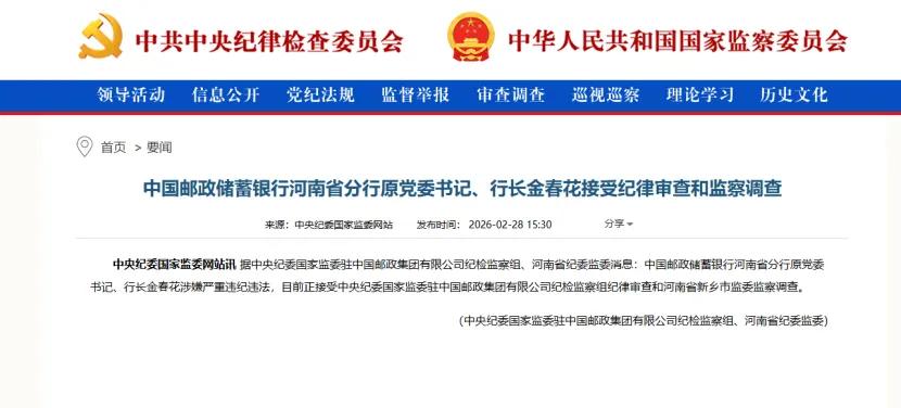 2月28日,据中央纪委国家监委驻中国邮政集团有限公司纪检监察组、河南省纪委监委消息:中国邮政储蓄银行河南省分行原党委书记、行长金春花涉嫌严重违纪违法,目前正接受中央纪委国家监委驻中国邮政集团有限公司纪检监察组纪律审查和河南省新乡市监委监察调查。