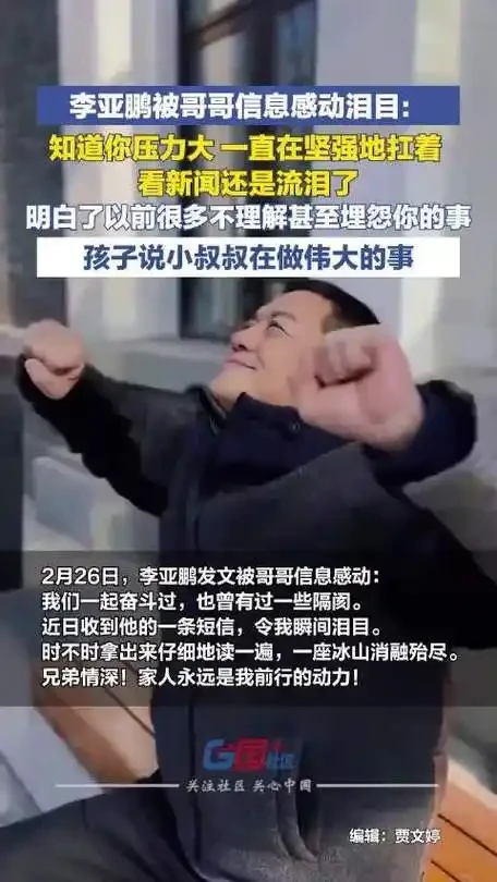 1月23日,哥哥李亚炜发来了一条长信。没有客套,没有寒暄,只有直击灵魂的忏悔与理解:“知道你压力大,一直在坚强地扛着,看新闻还是流泪了……终于明白了以前很多不理解甚至埋怨你的事。”