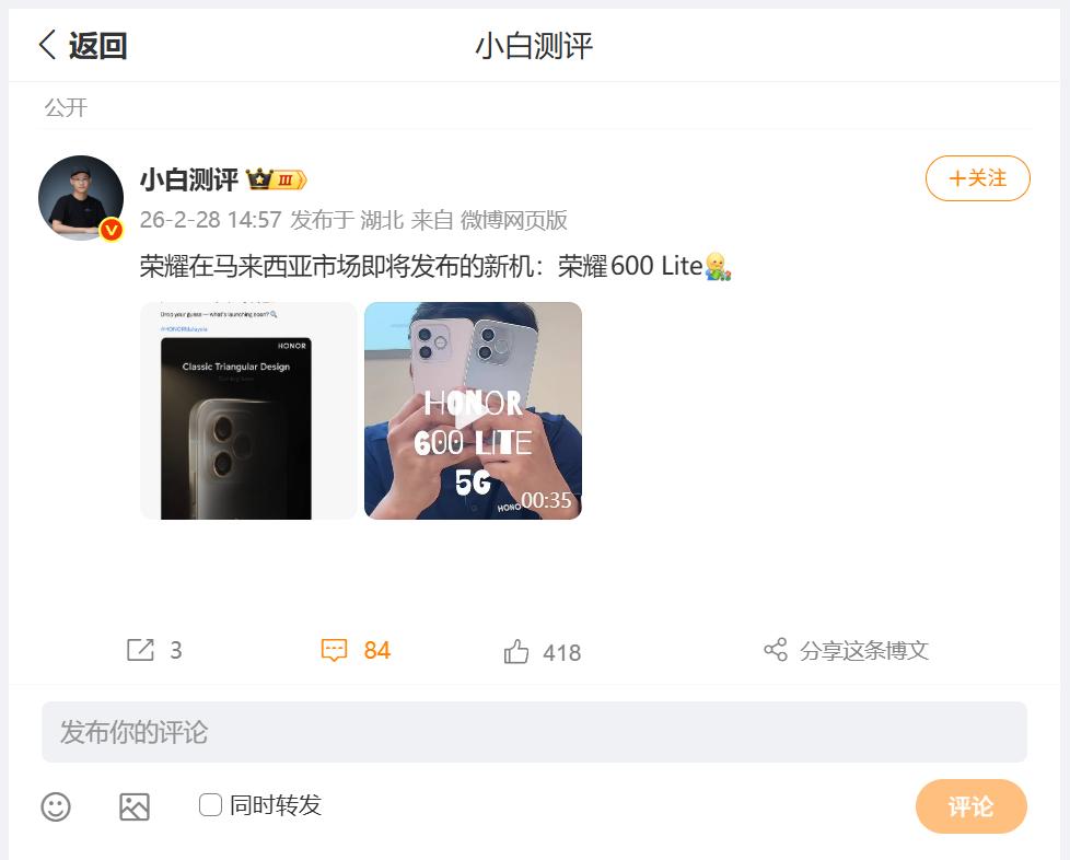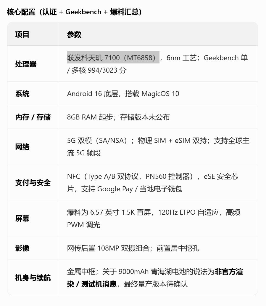 刚刚看到数码圈内大佬透露,一款型号为LNA-NX1的荣耀新机:荣耀 600 Lite,即将于3月在东南亚的马来西亚首发,虽然官方未宣布,但是但经多轮认证与权威爆料确认,预估为中端入门价位,刚刚我又利用豆包查询了下相关的核心配置,将会搭载联发科天玑 7100(MT6858) 畅聊数码新品 数码资讯