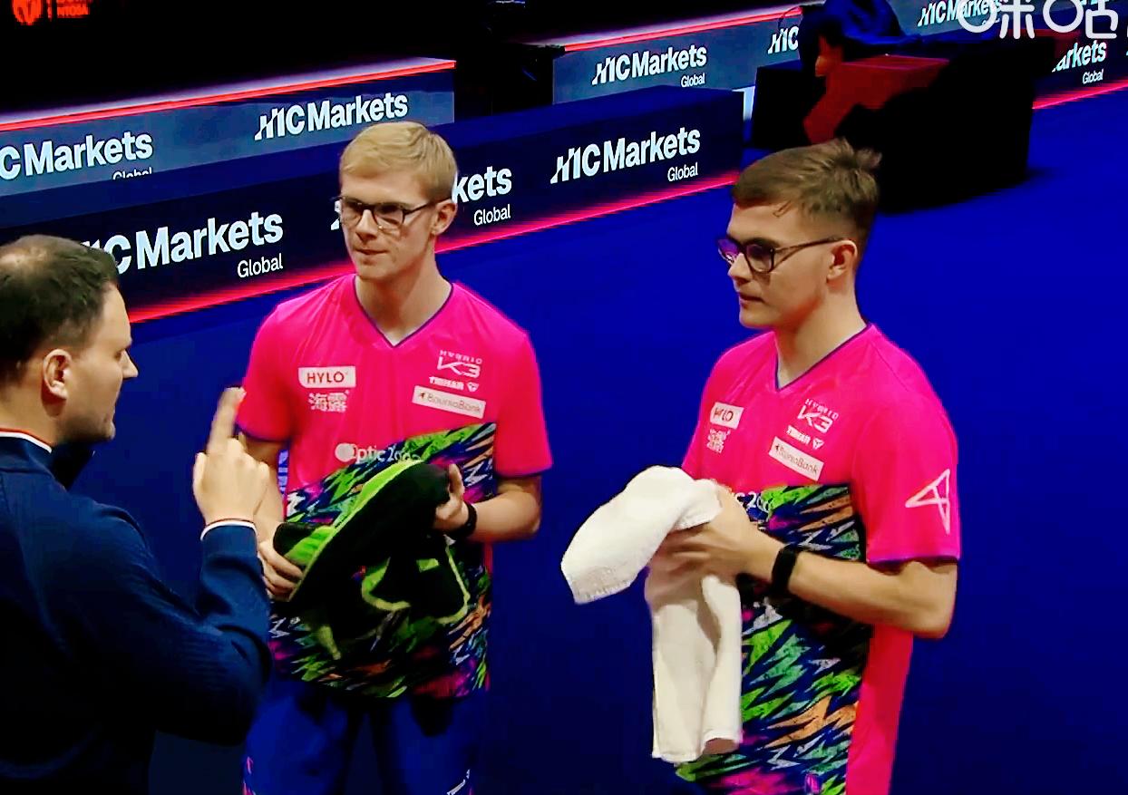 刘国正说:石油组合往前站,千万不要退! 勒布伦组合的速度非常快, 一退就没希望了! 打起来发现, 勒布伦兄弟中远台也很强。 第一局 石油组合太谨慎, 开局一直落后, 最后6:11输了 第二局 石油组合3:0领先 结果勒布伦兄弟4:3反超, 王皓叫了暂停, 结果又是无效暂停, 勒布伦6:3领先。 石油组合6:11再输一局。 第三局 石油组合终于开始拼了, 两队胶着, 勒布伦中远台也很强, 11:7拿下 石头组合0:3输了!