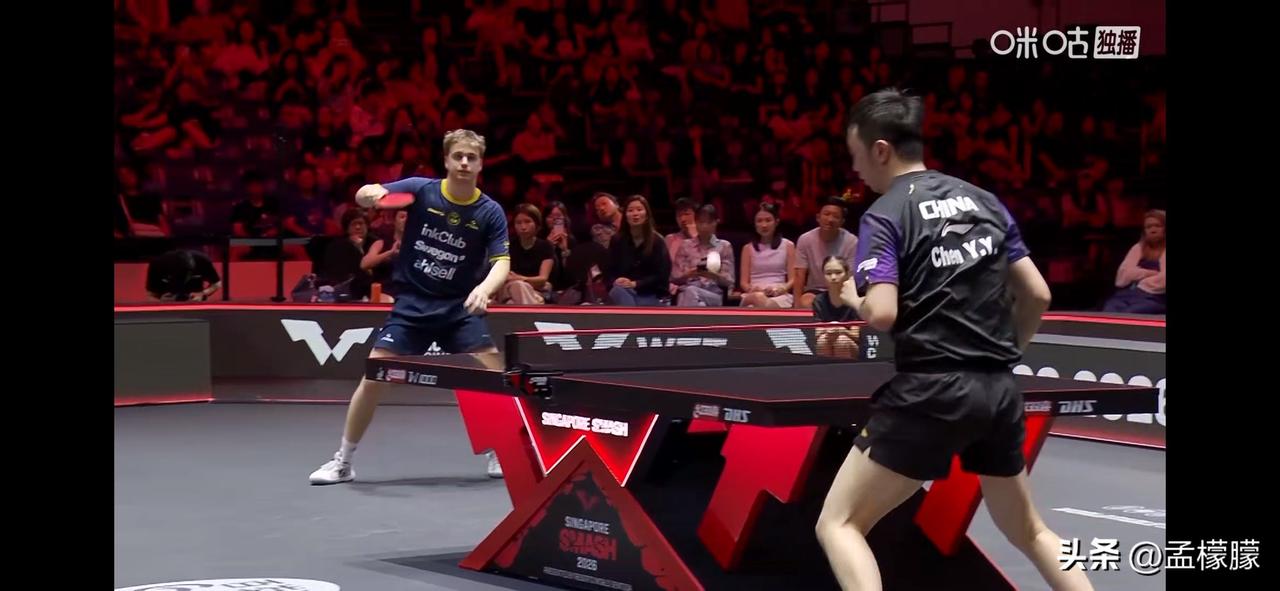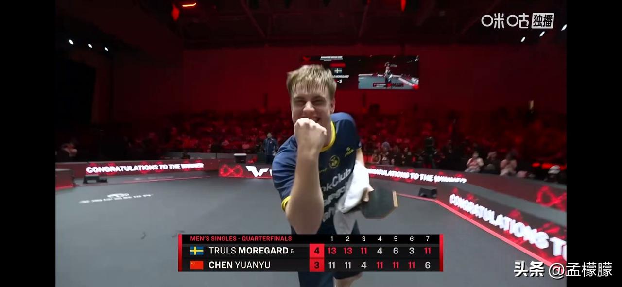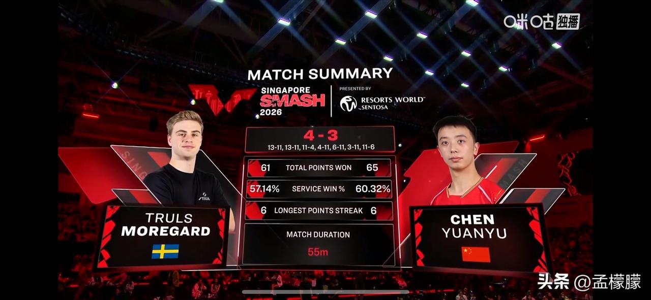 陈垣宇决胜局负于瑞典名将莫雷加德,无缘WTT新加坡大满贯2026男单四强 比分是: 陈垣宇🇨🇳3-4特鲁斯·莫雷加德🇸🇪【11-13,11-13,4-11,11-4,11-6,11-3,6-11】 乒乓球 WTT男单