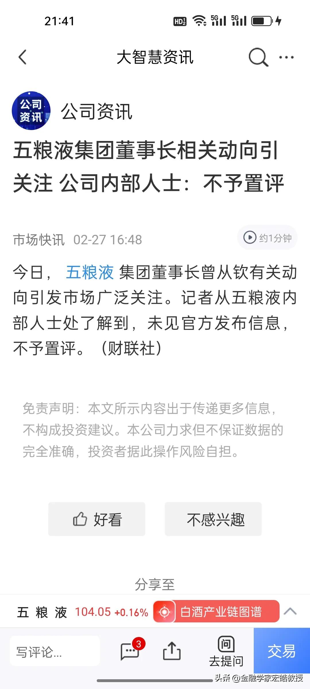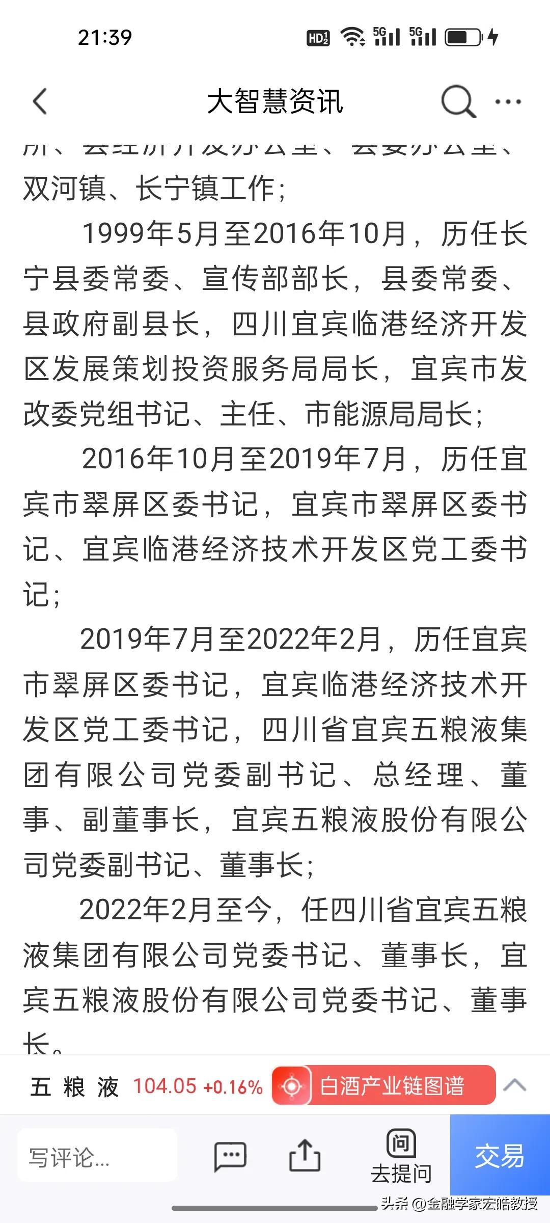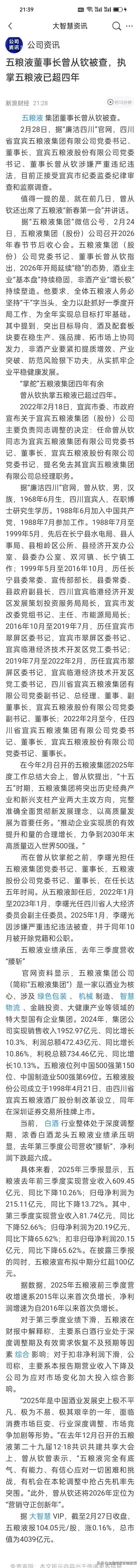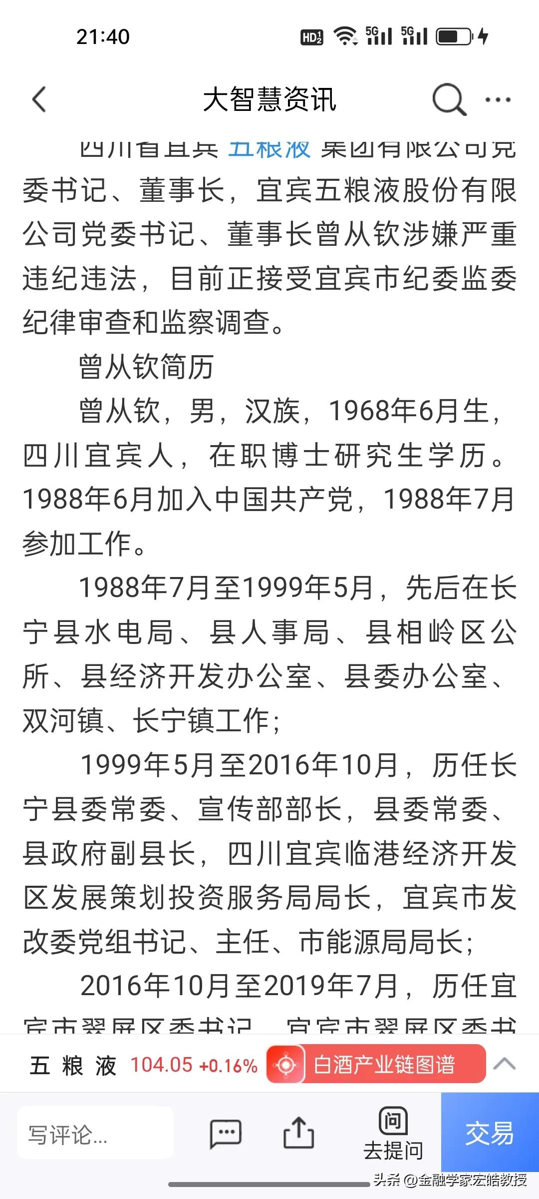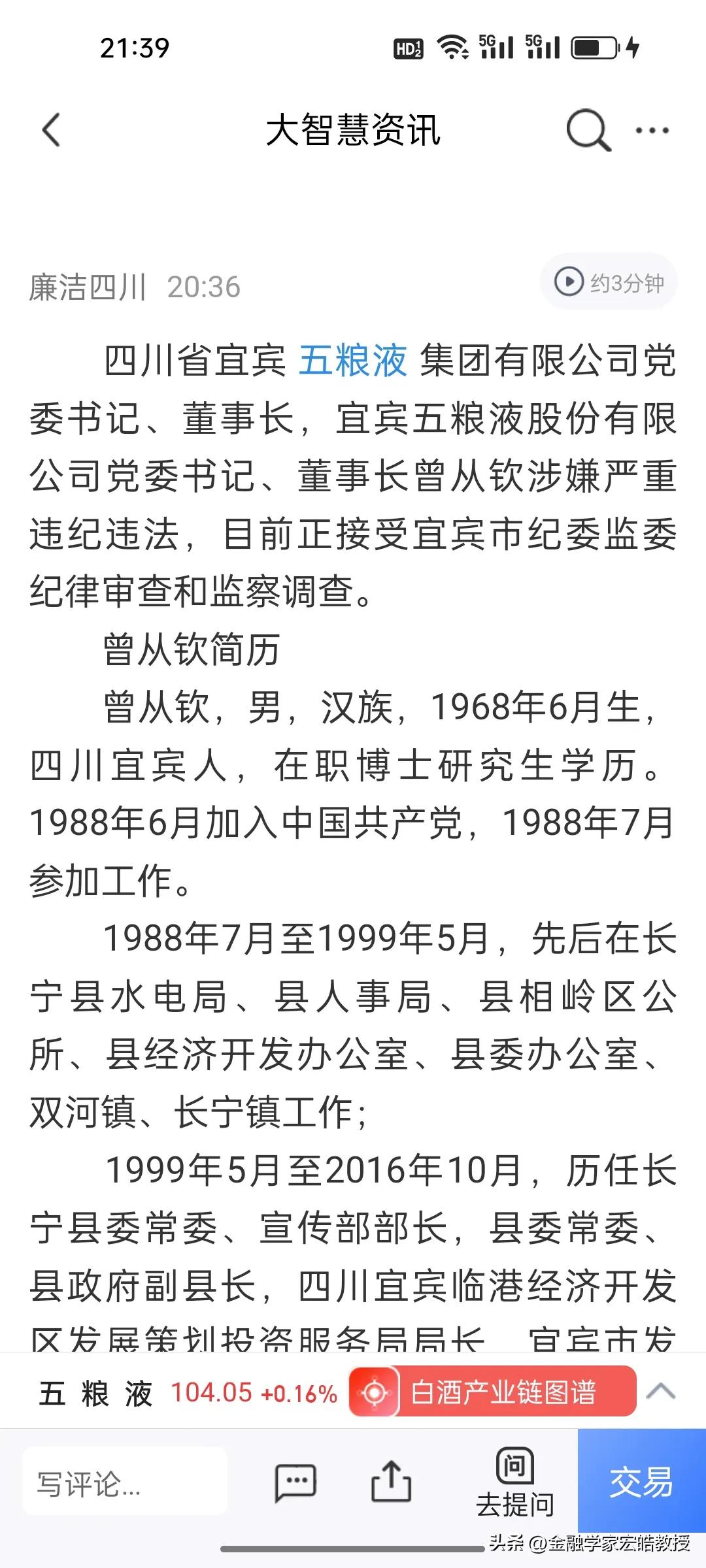 刚刚,五粮液突发利空!执掌五粮液四年多的58岁的曾丛钦确认被查!周五尾盘,五粮液一笔大单砸盘就很不寻常,现在看来早有预兆。 今天下午四点,《财联社》记者就问过五粮液内部人士关于曾从钦的去向,该内部人士就说未见官方发布信息,不予置评。 今年以来,五粮液从年内高点110.78元一路下跌,累计跌幅近10%,股价持续低迷。更值得警惕的是,这并非五粮液高管首次出事,前任董事长李曙光去年也已被查、双开,短短数年两任董事长接连落马,公司治理问题暴露无遗。 高层震荡叠加股价疲软,五粮液再遇重大考验。近十年来,白酒龙头贵州茅台也已有三任董事长(袁仁国,高卫东,丁雄军)先后被查。下周开盘白酒板块恐受拖累,投资者需警惕情绪性杀跌风险。