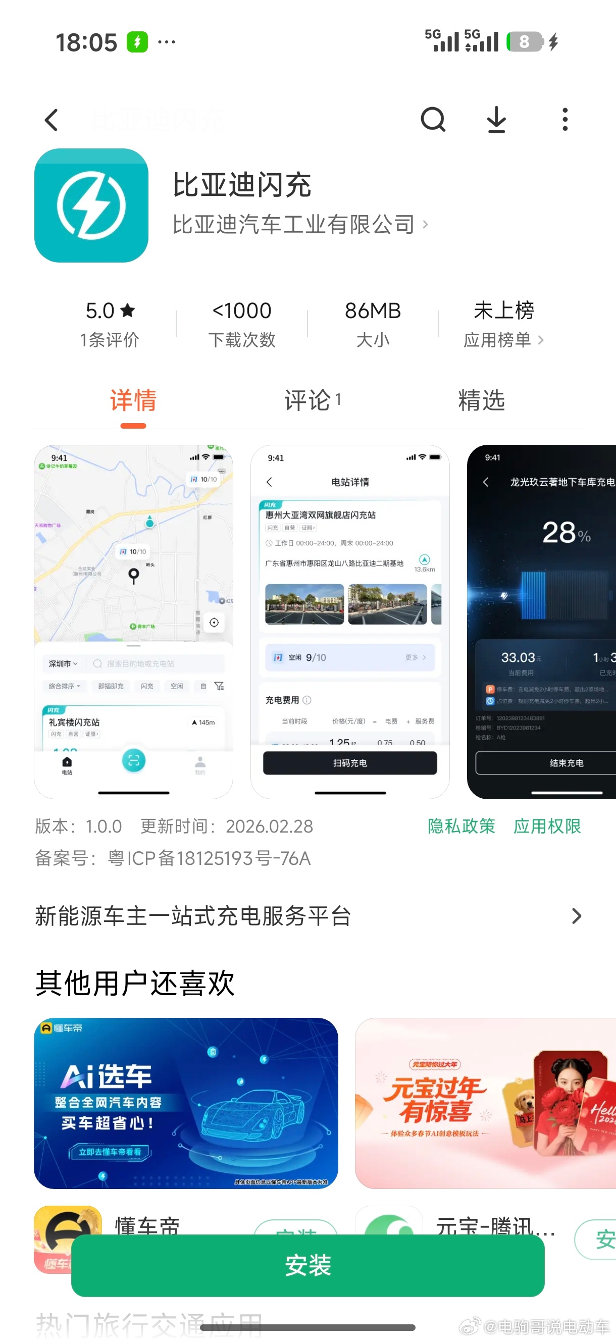比亚迪闪充APP上线了,刚刚试了一下,目前只有安卓手机能安装。支持即插即充 + 无感支付,快来看看你在的区域有没有被覆盖?比亚迪兆瓦闪充比亚迪闪充