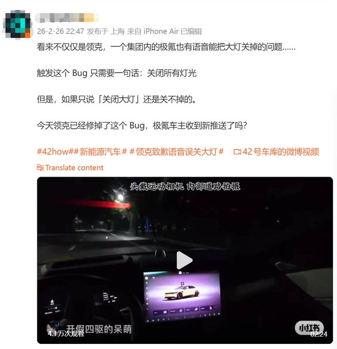因为在出事后,有不少领克车主测试过各种口令,当喊出“关闭灯光”或者“关闭所有车灯”的时候,领克车型就会出现和视频中一样的操作:关掉大灯,且打不开。
