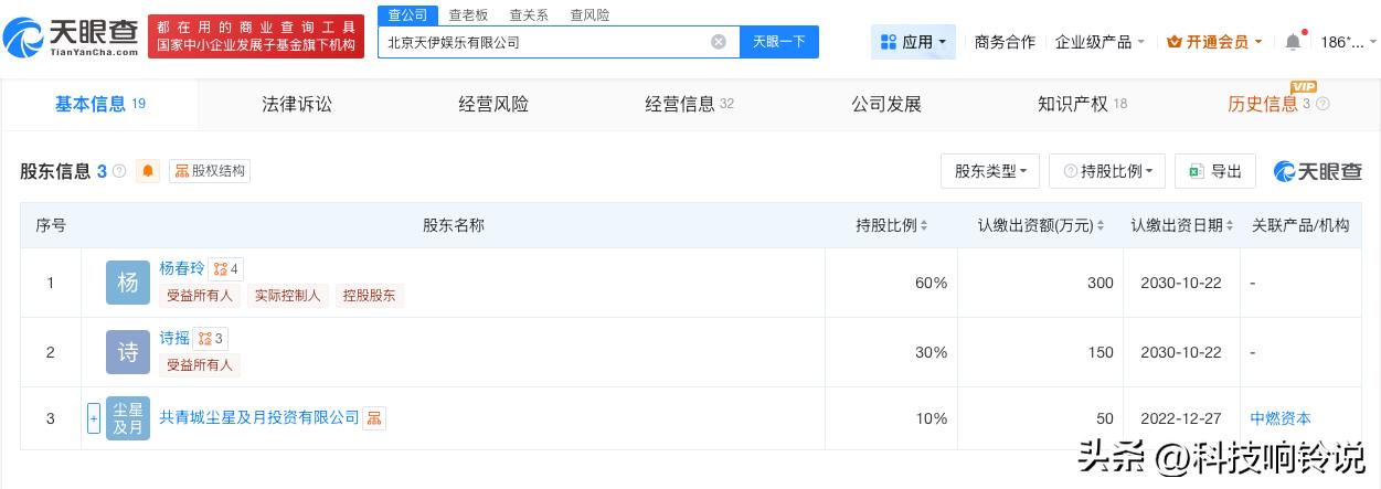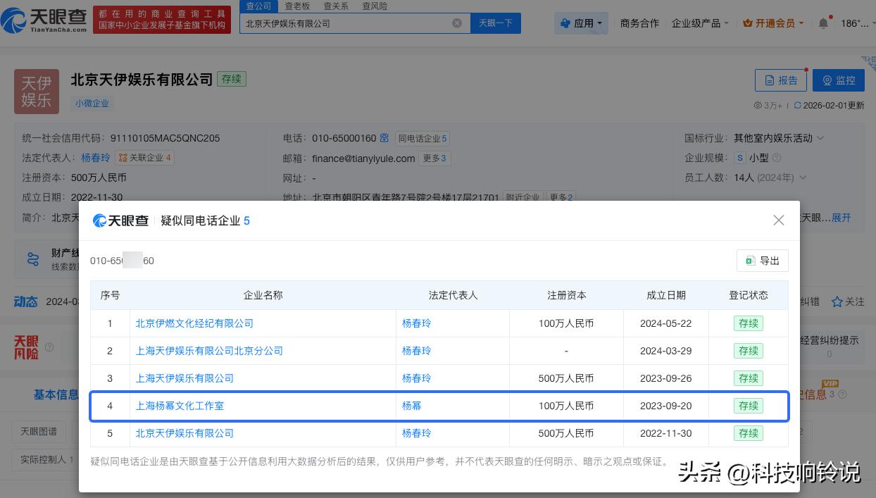 【迪丽热巴与杨幂公司联系方式相同 迪丽热巴与杨幂公司有关联】曝迪丽热巴签约天伊娱乐 近日,网传迪丽热巴与经纪公司嘉行传媒合约到期后签约天伊娱乐。 天眼查工商信息显示,天伊娱乐关联北京天伊娱乐有限公司成立于2022年11月,法定代表人为杨春玲,注册资本500万人民币,经营范围包括剧本娱乐活动、组织文化艺术交流活动等。股东信息显示,该公司由杨幂母亲杨春玲、诗摇、共青城尘星及月投资有限公司共同持股。 值得注意的是,北京天伊娱乐有限公司与上海杨幂文化工作室共用一个邮箱和电话。此外,迪丽热巴名下上海镜砚影视文化工作室等与杨幂名下上海杨幂文化传媒中心、上海杨幂影视文化工作室年报公示电话相同。 天眼查信息: