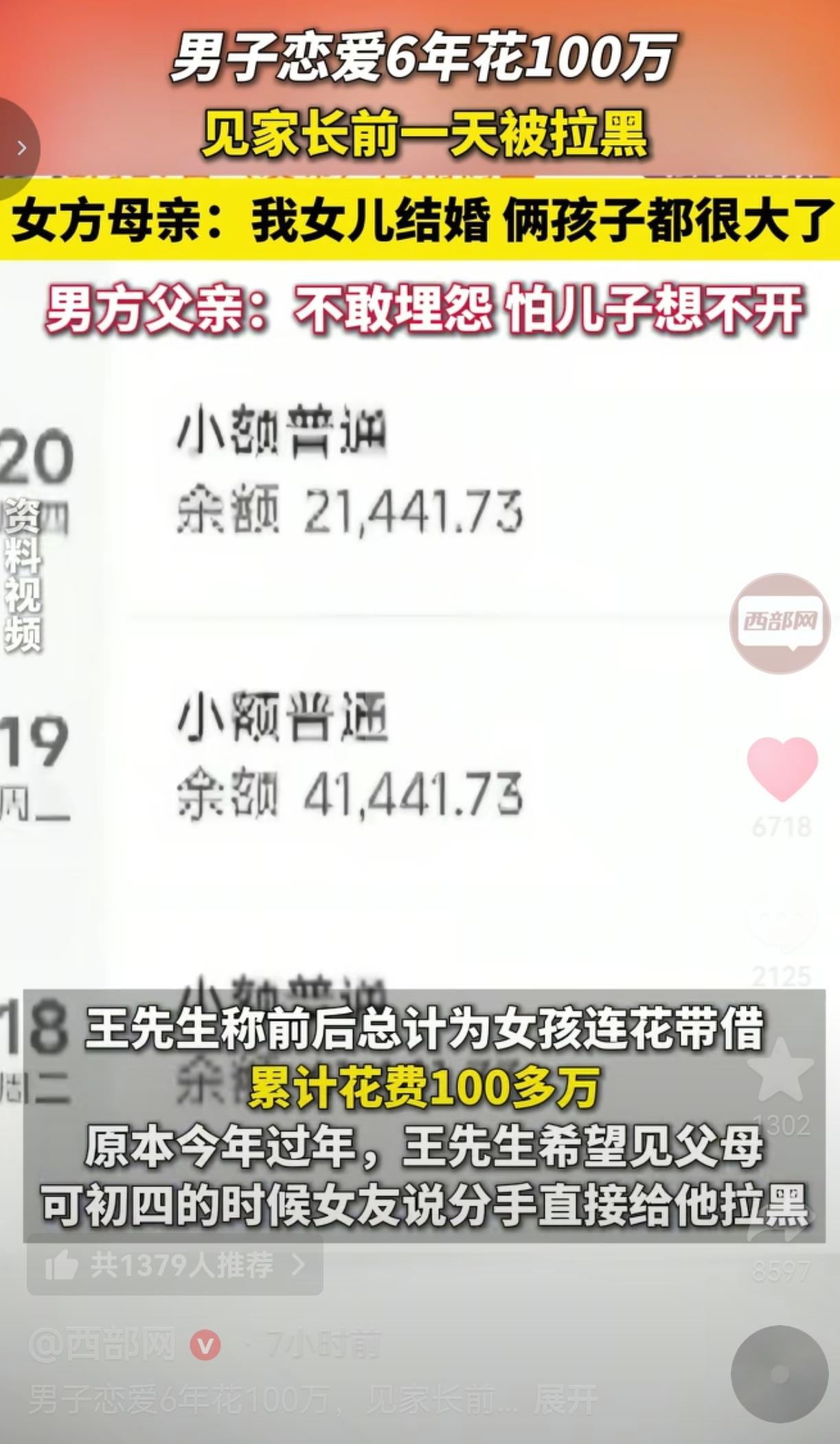他掏心掏肺的爱,原来是一场精心策划的骗局!河南的王先生,今年30岁,大学毕业后就一头扎进工厂打工,本以为能靠自己的双手,拼出一个安稳的家。 2020年,他在厂里认识了一个让他魂牵梦萦6年的女人。 他以为自己遇到了真爱,掏心掏肺,把所有的温柔和钱都砸了进去。 6年里,女友以“母亲重病住院、自己眼睛手术要进ICU、还高利贷、网络订婚”等各种理由,一次次向他伸手要钱。 王先生呢?也是深陷爱情的旋涡,竟然真的信以为真。他不仅花光了自己所有的积蓄,还背上了近50万的贷款,甚至向家里伸手,前后累计砸进去100多万。 他说:“我为她花钱,从来都是奔着结婚去的。” 在此期间,他5次提出要见家长,都被对方以各种理由搪塞过去。今年春节,他终于盼到了双方家长见面的日子,满心欢喜地等着大年初五,把婚事定下来。 可就在见面的前一天,女友突然发来一句:“我父母不同意,我们分手吧。”然后,就把他拉黑了。 那一刻,王先生的世界塌了。他像疯了一样四处打听,最后带着记者找到了女方的老家。 开门的是女方母亲,当王先生拿出照片时,对方却冷漠地说:“我不认识你,我女儿早就结婚了,两个孩子都上初中了!” 原来,他爱了6年、等了6年、付出了6年的“未婚妻”,竟然是一个早已为人妻、为人母的女人。 而那些“母亲重病、手术抢救”的悲情故事,全是她编出来骗钱的谎言。 更让人心碎的是,王先生的父亲在镜头前老泪纵横,他说:“我不敢埋怨孩子,怕他受刺激想不开。” 网友看到后评论说:“这女的是把他当ATM机了吧?还是那种24小时不打烊的!” 还有的网友说:“他不是傻,他是太渴望有个家了。”   要我说,这哪里是恋爱,分明是一场长达6年的诈骗。 王先生错了吗?他只是太想爱了,太想有个家了。他把对方的每一句话都当真,把每一次要钱都当成是“为了我们的未来”。他以为自己在为爱情添砖加瓦,殊不知,他只是在给别人的家庭“交房贷”。 我们总说,爱要真诚,要毫无保留。可现实却一次次给我们上课:在这个复杂的世界里,毫无保留的爱,有时候真的会变成刺向自己的刀。 那些在感情里只知道索取、从不付出的人,他们消费的不仅仅是你的钱,更是你对人性的信任,是你对爱情的向往。当信任被消耗殆尽,再想重新去爱一个人,就难了。 王先生的遭遇,也给我们所有人提了个醒:任何以“结婚”为名义,却始终回避见面、回避公开的关系,都值得警惕。 同时,当对方频繁以各种理由向你要钱,尤其是涉及到“家人重病”“紧急手术”等悲情戏码时,一定要多留个心眼。 还有就是,爱可以掏心掏肺,但不能没有底线。在付出之前,先确认对方是不是值得。