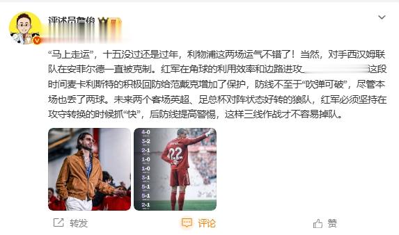 “马上走运”,十五没过还是过年,利物浦这两场运气不错了!当然,对手西汉姆联队在安菲尔德一直被克制。红军在角球的利用效率和边路进攻上终于有改善,这段时间麦卡利斯特的积极回防给范戴克增加了保护,防线不至于“吹弹可破”,尽管本场也丢了两球。