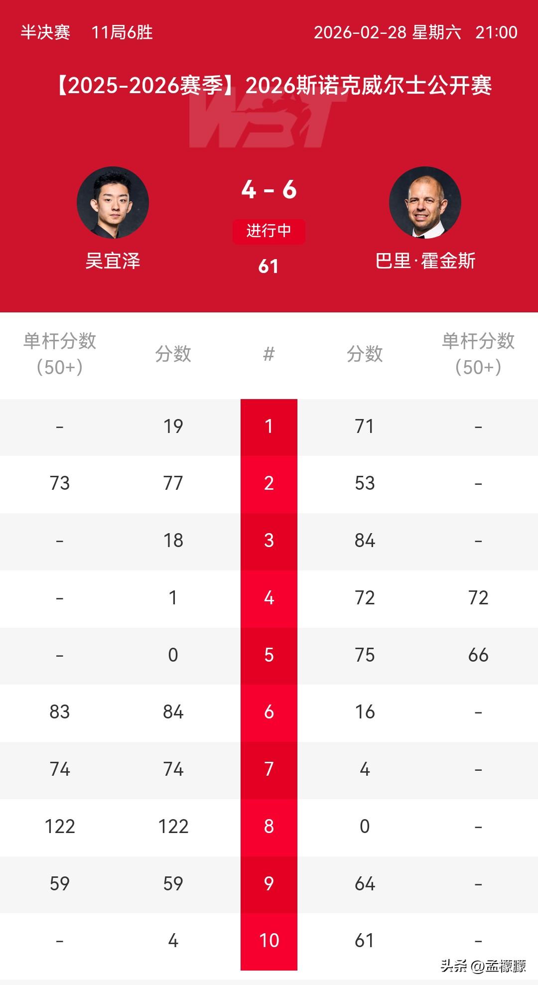 北京时间3月1日讯,2026斯诺克威尔士公开赛第一场半决赛比赛,吴宜泽对阵四强常客霍金斯。 上半场吴宜泽1-3落后。 下半场,霍金斯开场75:0,4-1拿到赛点。吴宜泽发力,84:16,74:4,122:0连扳三局,总比分来到4-4。可惜第9局出现失误,59:64输了第9局。第10局,吴宜泽心态出现问题,4:61。吴宜泽总比分4-6不敌霍金斯。 另一场半决赛对阵: 希金斯🆚小司机 (1日 3:00进行) 半决赛只要小司机战胜希金斯,小司机就可获得本土系列赛15万英镑额外奖金。 斯诺克 一起聊聊斯诺克 威尔士公开赛周跃龙 希金斯 斯诺克四强