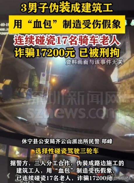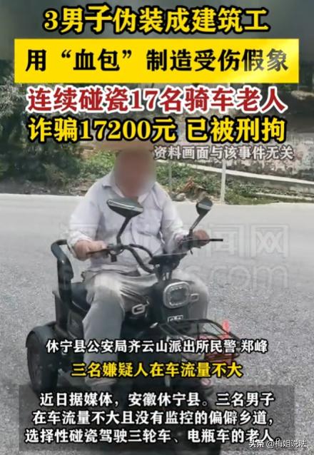 17名老人,被3男子用“血包”碰瓷诈骗17200元!安徽黄山,休宁。72岁的王大爷骑着三轮车赶路,被3男子碰瓷讹去1000元。事后气不过报警,谁知竟牵出一个专门针对老年人的诈骗套路。家里有老人的,可得小心了。 72岁的王大爷(化名)省吃俭用攒点养老钱,骑三轮车在偏僻乡道赶路时,没招谁没惹谁,突然被3个伪装成施工人员的男人碰瓷。 对方捂着胳膊、血糊糊一片,围着他索要医药费,老实的大爷慌了神,稀里糊涂就把身上仅有的1000多块养老钱全掏了出去。 事后王大爷老憋屈了,平白无故丢了1000多块,一连几天茶饭不思,血压居高不下。他的孩子问了缘由,觉得事有蹊跷,就带着王大爷报了警。 谁能想到,这一报竟揪出一个专门盯着农村老人下手的碰瓷团伙,3个大男人,靠着演技和假血包,在黄山、江西等地流窜作案,专挑偏僻乡道下手,先后有17位老人中招,被骗的全是养老钱、买菜钱! 为了守护老人们的养老钱,民警立马成立专项小组,详细询问王大爷嫌疑人的特征,王大爷回忆,那是三个中年男人,穿灰色工装,一人留寸头、带江西口音,身高约1米7。 接下来几天,民警天天泡在监控室,调取所有能找到的监控,就连路边农户私装的监控也一一上门查看,可事发乡道偏偏是监控盲区,嫌疑人早就踩好了点。 更棘手的是,这伙人特别狡猾,流窜作案、打完就跑,民警只能顺着乡道出入口排查车辆,走访周边村民寻找线索。 功夫不负有心人,排查第三天,有村民反映,曾在另一条偏僻乡道看到三个穿工装的男人,围着一位骑电瓶车的老奶奶要钱。 还有村民说,见过他们开着一辆黑色小轿车,常在黄山和江西景德镇之间往返。 民警顺着这条线索追查,调取两地高速、国道监控,最终锁定了戴某、刘某、潘某三名犯罪嫌疑人的身份和轨迹。 摸清轨迹后,民警果断出击,在这伙人作案后逃窜至黟县的必经之路设下埋伏,成功拦截嫌疑车辆,将三人全部抓获。 民警打开他们车后备箱,差点都气笑了,里面全是作案工具:假血包、灰色工装、铁锹、扳手,还有纱布和红药水,碰瓷道具一应俱全! 面对证据,三人再也嘴硬不起来,一五一十交代了犯罪事实。 原来,三人早就合计好,专挑农村老人下手。他们知道老人防范意识弱、遇事易慌乱,偏僻乡道无监控、难留证据,就伪装成周边的施工人员降低老人警惕。 他们分工明确,一人伪装施工、一人碰瓷装伤、一人围堵要钱,每次提前踩点,等老人经过就故意靠过去,用假血包制造受伤假象,再恐吓老人赔钱。 截至被抓,他们在休宁县连续作案17起,涉案总金额17200元。 这些被他们碰瓷的老人大多经济条件较差,被骗的都是省吃俭用的养老钱,有的老人被骗后心疼得好几宿没睡,甚至不敢单独骑车上街。 破案后,民警第一时间联系所有受害老人,通知他们来派出所领钱。 那天,十几位老人陆续赶来,有的拄着拐杖、有的被儿女搀扶着,接过钱时,脸上的愁云全散了。 80岁的李奶奶握着民警的手直掉眼泪:我还以为我的棺材本没有了。 目前,戴某、刘某、潘某已被依法刑事拘留,案件正在进一步侦办中,等待他们的必将是法律的严惩! 那么,这伙骗子触犯了什么法律? 很多人觉得碰瓷只是讹钱,最多拘留罚款,其实不然,他们的行为已经构成诈骗罪,还是团伙诈骗,性质很严重! 具体来讲,他们故意编造被撞伤的假事实,用假血包欺骗老人,让老人误以为自己撞了人、自愿交出钱,这就是典型的诈骗。 而且他们多次作案、团伙作案,还专门针对老年人,属于情节较重。 根据《刑法》规定,诈骗公私财物数额较大的,处三年以下有期徒刑、拘役或管制,并处或单处罚金。 他们涉案17200元,已达“数额较大”标准,量刑时还会从重,最少也得蹲几年牢。 老人遇到碰瓷,千万别慌、别私下协商给钱,这正好中了骗子的圈套!一定要第一时间报警,留存现场证据,记住嫌疑人特征和车辆信息。 在偏僻乡道尽量少单独走,必要时结伴而行或给儿女发定位。 发现碰瓷诈骗线索及时向民警举报,一起揪出专骗老人的骗子,守护好老人们的养老钱! 最后,你们身边有没有遇到过碰瓷?遇到了会怎么处理?评论区聊聊!