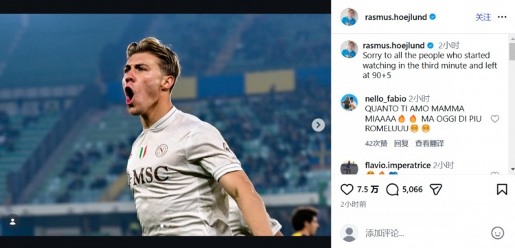 在社交媒体上,那不勒斯进球功臣霍伊伦调侃道:为那些第3分钟看球,然后在第95分钟离开的球迷感到遗憾。