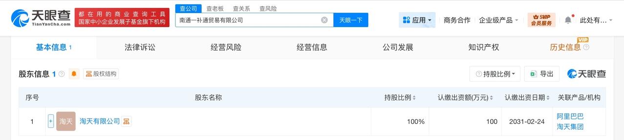 淘宝在南通成立一补通贸易公司 天眼查App显示,近日,南通一补通贸易有限公司成立,法定代表人为单勇超,注册资本100万人民币,经营范围含第三类医疗器械经营、出版物零售、出版物互联网销售、日用百货销售、互联网销售、家用电器销售、食品互联网销售、家用电器研发、玻璃纤维增强塑料制品销售等,由淘宝旗下淘天有限公司全资持股。 天眼查信息: