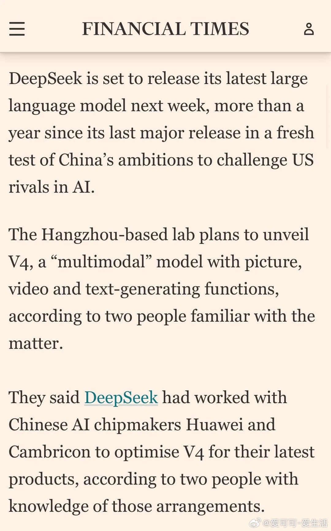 快速导读:FT爆料DeepSeek V4下周发布,支持图片、视频、文本生成。但评论区真正的争议不是“什么时候发”,而是这个模型到底跑在什么芯片上——华为和寒武纪。