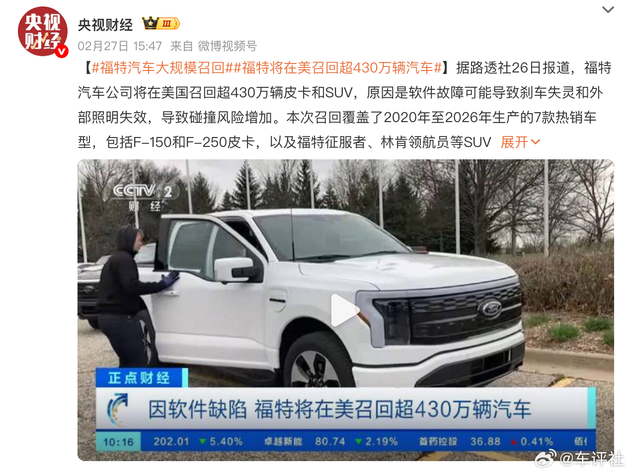 【福特超430万辆车大规模召回】据央视报道,近日因软件问题,福特汽车宣布将在美国召回430万辆皮卡和SUV。涉及召回的车型为生产日期在2021年至2026年款F-150、2022年至2026年款F-250 SD、林肯领航员、探险者、Maverick及部分Ranger和E-Transit车型。官方表示,这些车辆或因为软件问题,在某个模块或存在与车辆失去通信的情况,从而导致刹车灯和转向灯失效,或刹车功能完全丧失,增加安全隐患。后续,官方将通过OTA软件更新来解决该问题。车评社汽车315