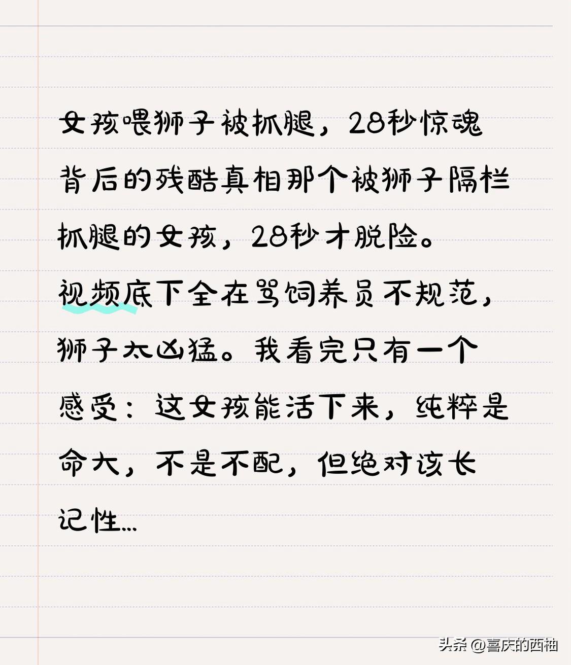 女孩喂狮子被抓腿,28秒惊魂背后的残酷真相 那个被狮子隔栏抓腿的女孩,28秒才脱险。视频底下全在骂饲养员不规范,狮子太凶猛。我看完只有一个感受:这女孩能活下来,纯粹是命大,不是不配,但绝对该长记性。 动物园的三令五申,在有些人眼里就是一张废纸。"不能投喂"四个字写得比脸盆还大,但总有人觉得"我就喂一口,能出什么大事"。结果呢?狮子隔着栏杆一爪子过来,你28秒都挣脱不了。要是栏杆再宽五厘米,你现在就在狮肚子里消化了。 最气人的是什么?这种事不是第一次,也不会是最后一次。去年北京动物园,有人喂马来熊吃饼干,手差点被咬掉;前年有个爸爸把孩子抱进老虎园区,结果大家都知道了。每一次出事,全网骂一遍,然后遗忘,然后下一个勇士继续挑战动物底线。 我们总说动物凶猛,其实最不可预测的是人。动物有本能,人有"我觉得我能行"。狮子的本能是捕食,你的本能应该是敬畏。但现实是,太多人把"规则"当成"建议",把"禁止"当成"只是说说而已"。直到血淋淋的伤口出现,才想起来"哦,原来真的会出事"。 饲养员有责任,但你自己的命是谁的?别人的疏忽可能害你,但你的愚蠢绝对会害死自己。28秒惊魂应该教会我们什么?不是狮子有多可怕,而是侥幸心理有多致命。那些还在计划着"下次悄悄喂"的人,我劝你们先看看视频,再摸摸自己的脖子——它可没有狮子的爪子硬。