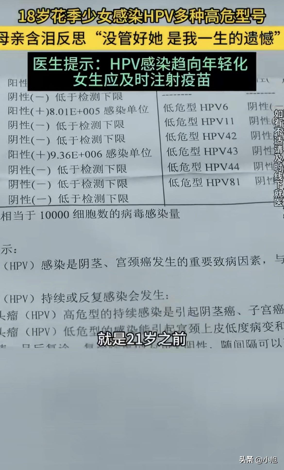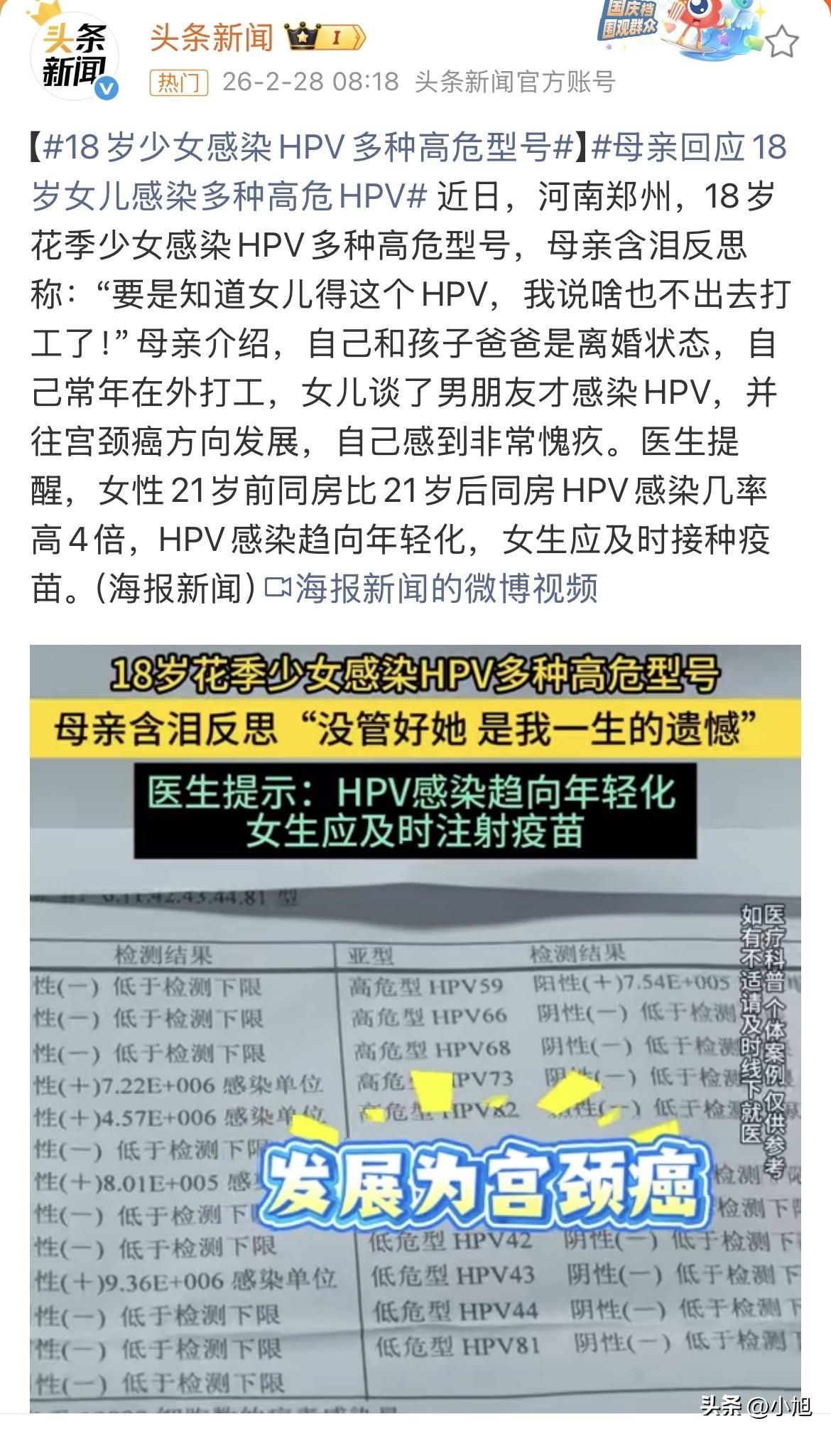 绷不住了?郑州一个18岁女孩,被查出感染了多种高危型HPV。 医生的话很直接,已经在往宫颈癌的方向发展。母女俩在医院抱头痛哭,当妈的一遍遍念叨,要知道会这样,说啥也不出去打工了。 据海报新闻报道,这个女孩的父母早就离了婚,妈妈常年在外头打工,一年到头回不了几次家。女孩跟着老人过,啥时候谈的男朋友,妈妈根本不知道。等知道的时候,已经是这个结果。 有个细节让人心里发堵。医生说,女性21岁前有性生活,感染HPV的几率比21岁后高出4倍。这个18岁女孩,正好撞在了枪口上。 记者追问那男的是谁,女孩低着头不说话。她妈也不知道,就知道是打工时候认识的。 查了些资料,心里更沉了。中国女性HPV感染率有两个高峰,第一个就是17岁到24岁。中国疾控中心的数据显示,2012年那会儿,15到19岁年龄组初次性行为的中位数就已经是17岁了。 也就是说,像这个女孩一样的孩子,不是个例。 更扎心的是时间点。从2025年11月10号开始,国家已经把HPV疫苗纳入了免疫规划,2011年11月10号以后出生的满13周岁女孩,可以免费接种两针国产二价疫苗。 这个18岁的女孩,刚好被拦在了政策的外面。她13岁的时候,还没有这个免费政策。 南方周末报道说,郑州今年2月已经收到了首批2万支免费HPV疫苗,开始分发接种。但对于这个女孩来说,这些都晚了。 当妈的现在天天在医院陪着。医生说经过治疗,女孩的检查报告已经从阳性转成阴性了。但这件事,对这个家,对这个才18岁的姑娘,留下了啥,说不清。 有个研究数据挺吓人。2022年,在中国15到44岁的育龄女性里,宫颈癌发病率排在所有恶性肿瘤的第三位,死亡率排在第二位。 而且宫颈癌早期啥症状都没有。等发现了,往往已经麻烦了。 现在女孩的妈妈就盼着病情别再恶化。她说别的都不想了。 她就反复说那一句话,要知道会这样,说啥也不出去打工了。 你们说,这事儿到底该怪谁。