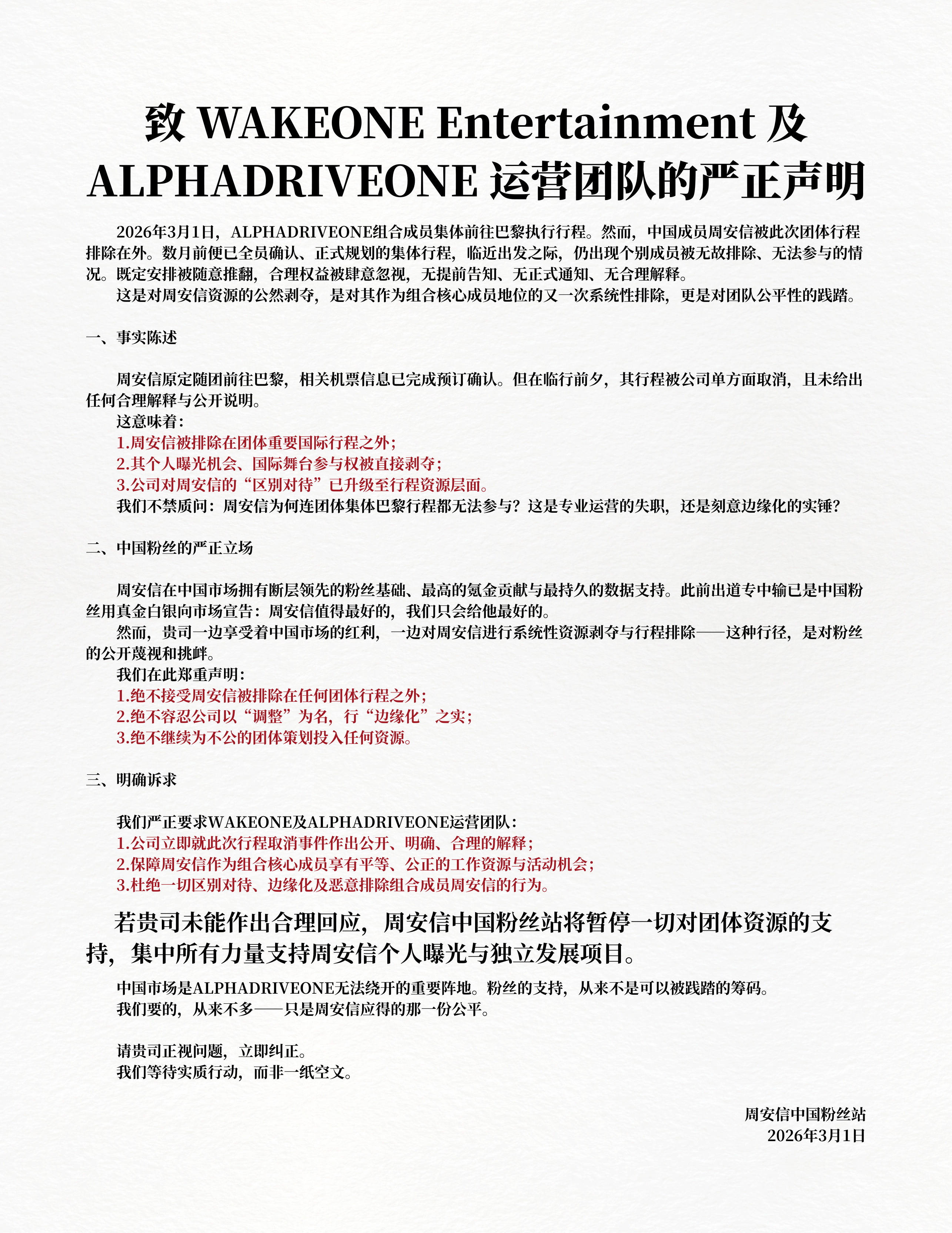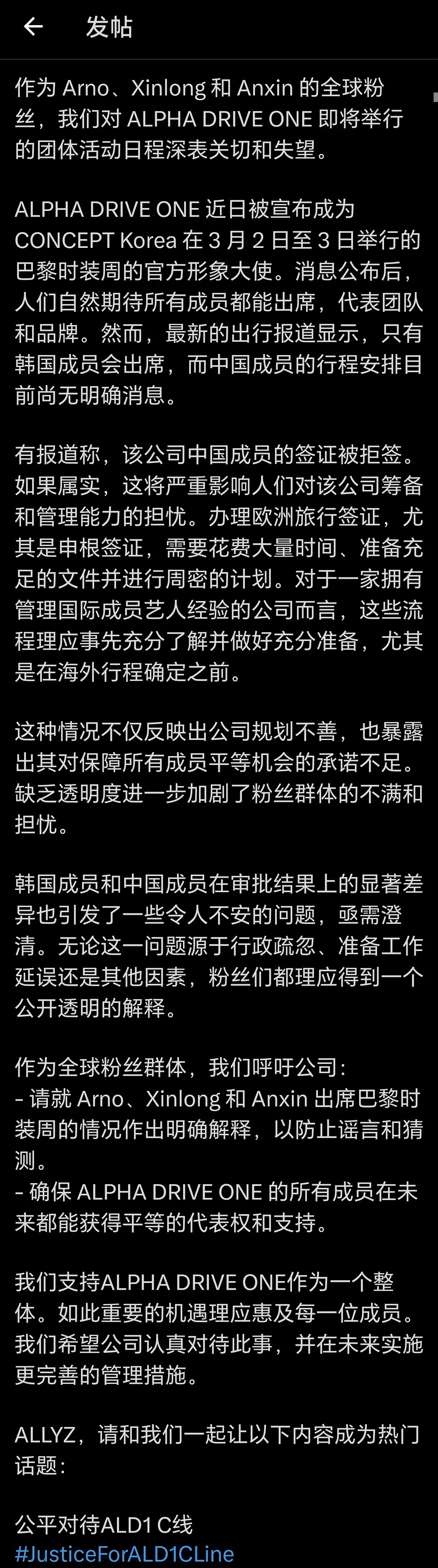 周安信贺鑫隆张家豪缺席巴黎时装周 ALD1中国成员周安信、贺鑫隆、张家豪缺席巴黎时装周行程,粉丝发文希望公司做出回应。