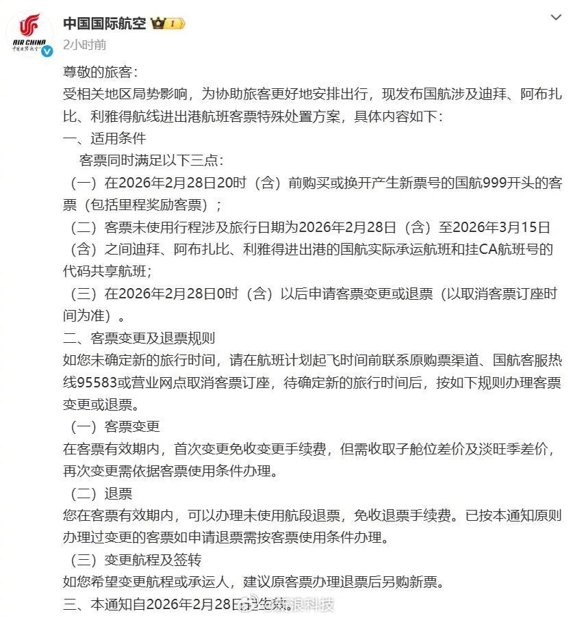 【东航国航南航集体公告】2月28日,中国东方航空、中国国际航空、中国南方航空集体公告,发布部分中东航班客票处置方案。(每经综合)