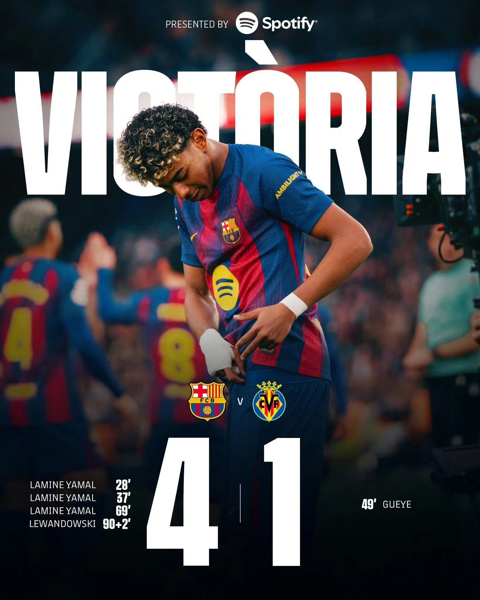 巴萨4比1比利亚雷亚尔西甲第26轮迎来焦点战,西甲领头羊巴萨坐镇主场迎战联赛排名第三的比利亚雷亚尔。上半场比赛,费尔明助攻亚马尔先拔头筹,随后后者一条龙再下一城,帮助球队扩大比分。下半场比赛,盖伊扳回一城,佩雷斯失良机,亚马尔单刀上演生涯首次帽子戏法,莱万补时阶段破门。最终,巴萨4比1大胜比利亚雷亚尔,先赛一轮的情况下领先第二名皇家马德里4分。逸达看球