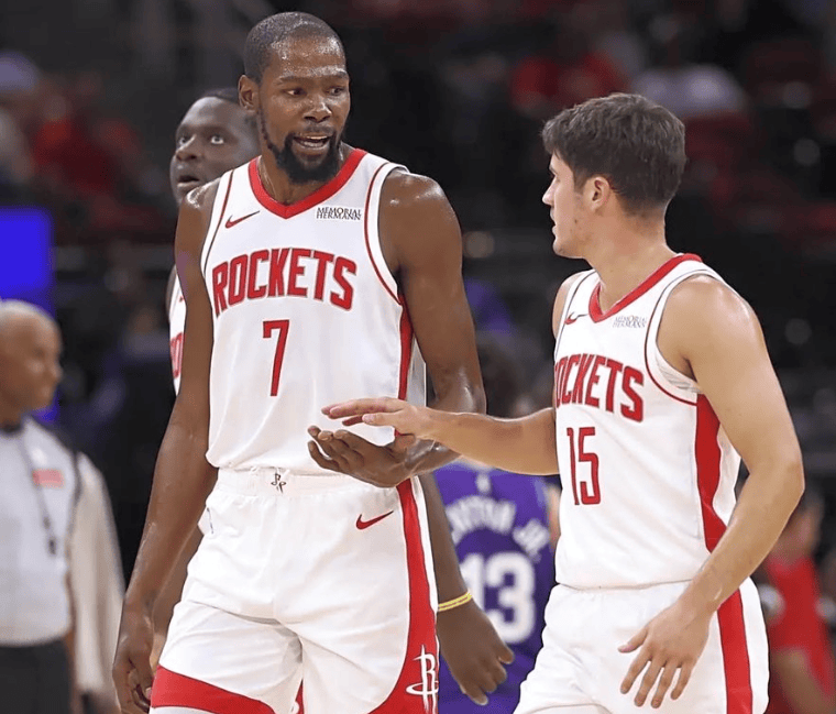 今天火箭首发阵容中,只有凯文-杜兰特和里德-谢泼德的正负值为正。