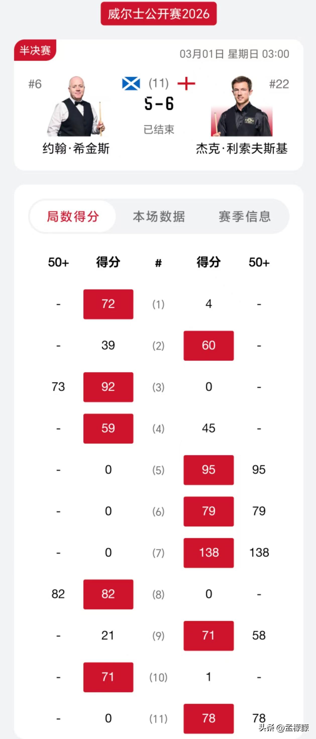 北京时间3月1日讯,2026斯诺克威尔士公开赛第二场半决赛1日3:00进行,由小司机利索夫斯基对阵“75三杰”之一的巫师希金斯。结果小司机6-5决胜局绝杀了希金斯,挺进半决赛,同时如愿拿下15万英镑额外大奖。 杰克·利索夫斯基在决胜局顶住巨大压力,以一杆技惊四座的单杆78分锁定胜局,总比分6-5绝杀希金斯,在最后时刻“撸走”了原本属于马克·艾伦的15万英镑系列赛大奖。这场胜利对于利索夫斯基意义非凡。由于本站是伟德系列赛的收官战,而系列赛奖金累计最高的球员将独享15万英镑额外大奖。原本领跑的本土名将马克·艾伦在本周首轮爆冷出局,给追赶者敞开了大门。利索夫斯基打入决赛,他凭借保底的4.5万半决赛奖金,在本土系列赛奖金积分榜上实现了对艾伦的反超,硬生生从艾伦手中抢走了这张15万英镑的巨额支票。 【比赛过程:】 在双方战成1-1后,巫师凭借一杆73分和一局59-45的琐碎胜利,带着3-1的领先优势进入局间休息。 然而休息回来后的比赛风云突变。小司机突然爆发,接连轰出单杆95分、79分和138分的惊艳“三连鞭”,神奇将比分反超为4-3。 陷入绝境的巫师在第八局用一杆82分稳住阵脚,将比分追至4-4平。 第九局,小司机抓住机会打出单杆58分,以5-4抢先拿到赛点。 第十局,胜利在望的小司机架杆打丢粉球,错失绝杀良机,巫师死里逃生,拿下71分,将比赛拖入决胜局。 决胜局中,巫师开局阶段的一次严重失误成为整场比赛的转折点。面对千载难逢的机会,小司机没有重蹈覆辙,他顶住压力,上手后直接轰出单杆78分,一杆制胜,彻底终结了比赛。 小司机决赛对阵霍金斯。两人此前交手11次,利索夫斯基4胜7负。最近的一次交手发生在2025年国锦赛的16强阶段,当时霍金斯以6-4击败利索夫斯基。 决赛赛程:(采用17局9胜制) 3月1日 21:00 利索夫斯基vs霍金斯 上8局 2日 03:00 第二阶段 斯诺克 一起聊聊斯诺克 威尔士斯诺克 威尔士公开赛吐槽个球