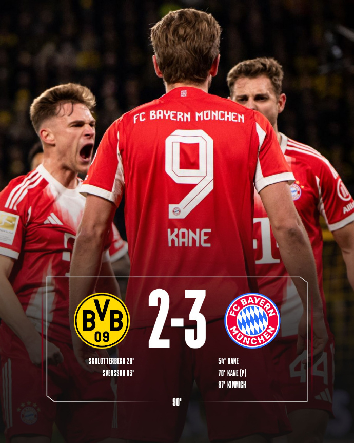 多特蒙德2比3拜仁慕尼黑德甲第24轮,拜仁在伊杜纳信号公园球场以3比2逆转战胜多特,迎来国家德比两连胜,以11分领跑德甲。